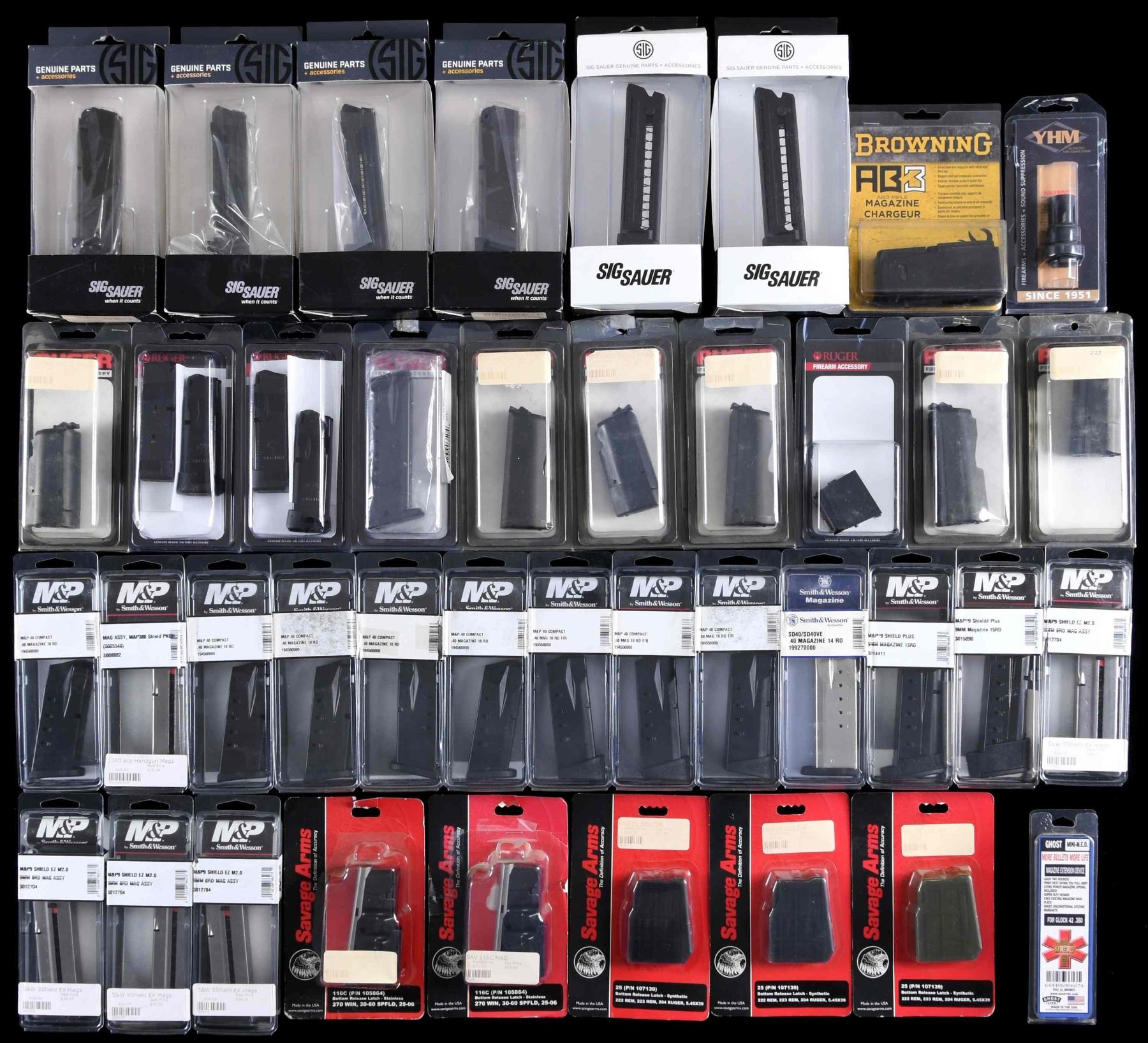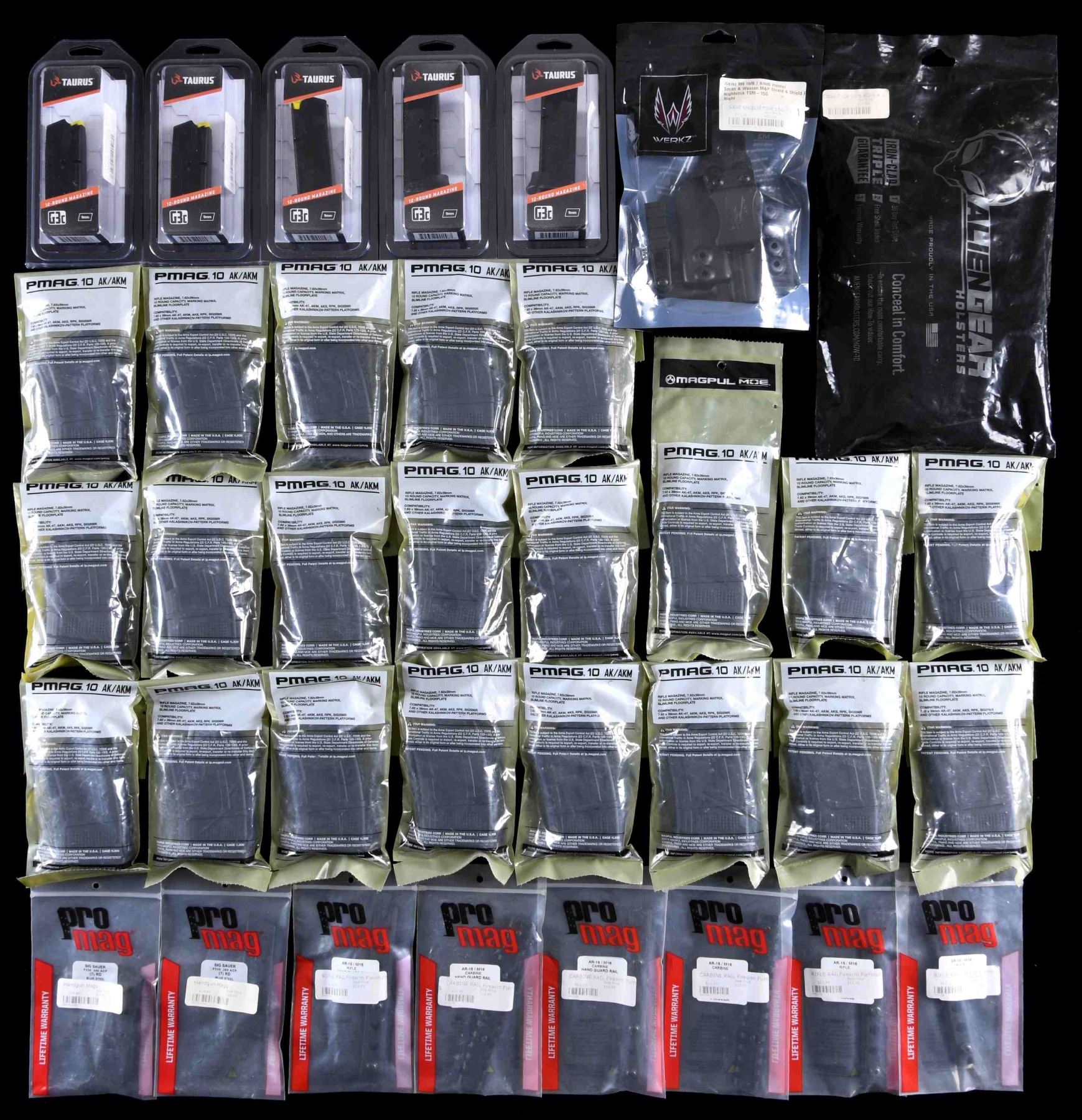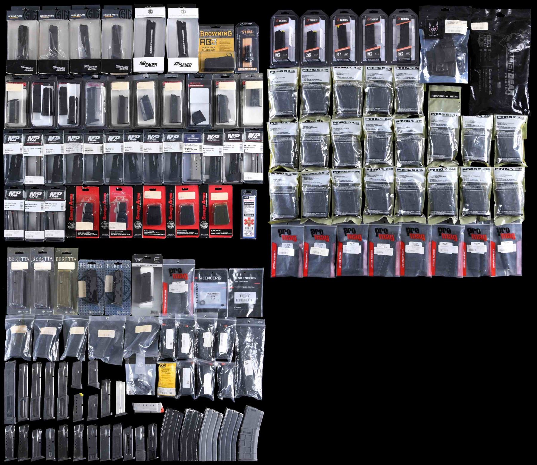 All items in new or excellent condition; some wear on loose magazines at end of listing. Counts carefully done but there may be an occasional numerical error. MAGAZINES - GLOCK: 1 G36 in 45ACP, 6 rd. / 4 in 9mm, 15 rd. / 2 G43X in 9mm, 10 rd. / 1 G42 in 380ACP w/ extension, 6 rd. / 1 G42 in 380ACP w/ +2 extension, 8 rd. / 1 G22-23-27 in 40 S&W, 22 rd. / RUGER: 1 JX-1 for 77/22 & 96/22, 10 rd. / 3 American Rifle in 223, 4 rd. / 3 American Rifle in 30-06 & 270, 4 rd. / 1 SR40/40c, 15 rd. / 2 Twin Packs LCP Max, 12 rd. / BERETTA: 3 PX4 in 45 ACP, 9 rd. / 2 PX4 in 40 S&W 14 rd. / TAURUS: 5 G3C in 9mm, 12 rd. / SAVAGE: 3 Model 25 for 222, 223, 204 & 5.45X39, 4 rd. / 2 Model 116C in 30-06, 25-06 & 270, 4 rd. / SIG SAUER: 2 P322 in 22LR, 20 rd. / 2 Mosquito in 22LR, 10 rd. / 2 SP2022 in 357Sig & 40 S&W, 12 rd. / 2 ProMag for P230 in 380ACP, 7 rd. / SMITH & WESSON: 8 M&P 40 Compact, 10 rd. / 4 M&P 9 Shield EZ M2.0, 8 rd. / 1 M&P Shield Plus, 15 rd. / 1 M&P Shield Plus, 13 rd. / 1 M&P 380 Shield, 8 rd. / 1 Ed Brown M&P 9 Shield, 8 rd. / BROWNING: 1 AB3 in 7mm Rem. Mag., 3 rd. / 21 MAGPUL PMAG for AK/AKM, 10 rd. / LOOSE MAGAZINES - AR 30 ROUND: 1 Okay, 2 Windham Weaponry, 1 D&H and 1 ProMag. / SMITH & WESSON: 1 Model 6906 in 9mm, 12 rd. / 1 M&P in 357Sig or 40 S&W, 15 rd. / 1 M&P Shield in 45ACP, 6 rd. / SPRINGFIELD: 1 XD in 40 S&W, 10 rd. / BERETTA: 4 92FS Cx4 in 9mm, 30 rd. / 1 92FS in 9mm, 17 rd. / 1 Px4 Sub Compact in 9mm, 13 rd. / SIG SAUER: 1 P365 in 9mm, 10 rd. / TAURUS: 1 PT709 in 9mm, 7 rd. / RUGER: 1 SR9 in 9mm, 19 rd. / PARA-ORDNANCE: 1 P12 in 45ACP, 12 rd. / 1 by Mec-Gar for P14 in 45ACP, 14 rd. / GLOCK: 1 G27 with finger extension in 40 S&W, 9 rd. / 1 G43 with finger extension in 9mm, 6 rd. / 1 G44 in 22LR, 10 rd. / 1 G42 in 9mm, 6 rd. / 1 in 45 ACP by SGM Tactical, 24 rd. / 6 SIRT 110f dummy magazines for Glock 17/22 style Dry Fire Lase Training pistol. / ASSESSORIES: 1 WERKZ M6 IWB/AIWB holster for S&W M&P Shield (Right). / 1 ALIEN GEAR IWB holster marked Springfield XD-S 40 Cloak Tuck. / PRO-MAG: 3 Carbine rails. / 4 Rifle rails. / SILENCER CO.: 2 Delta Threaded Rifle Spacers AC114, 1/2"-28. / 1 ASR 30 caliber brake, 9/16"-24. / 1 YHM (Yankee Hill Machine) muzzle brake marked "M13.5X1LH" with external silencer threads. (02-23806/NW). $1,000-2,000.
