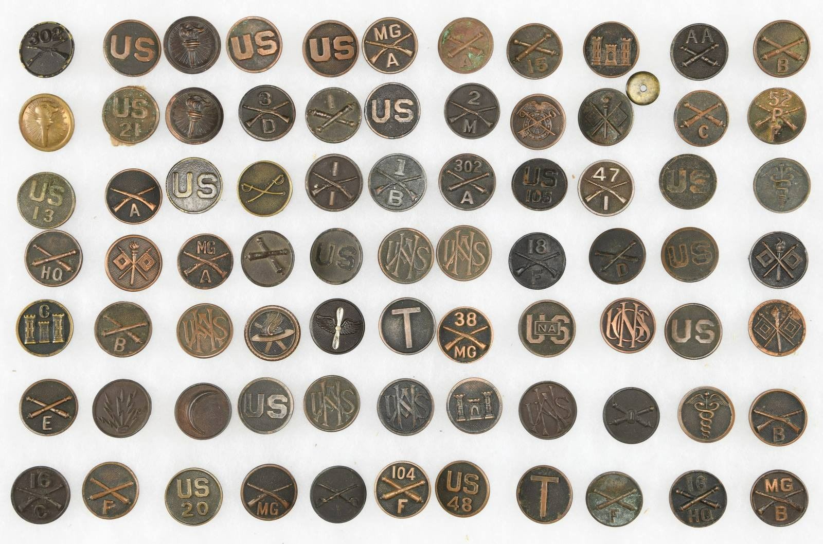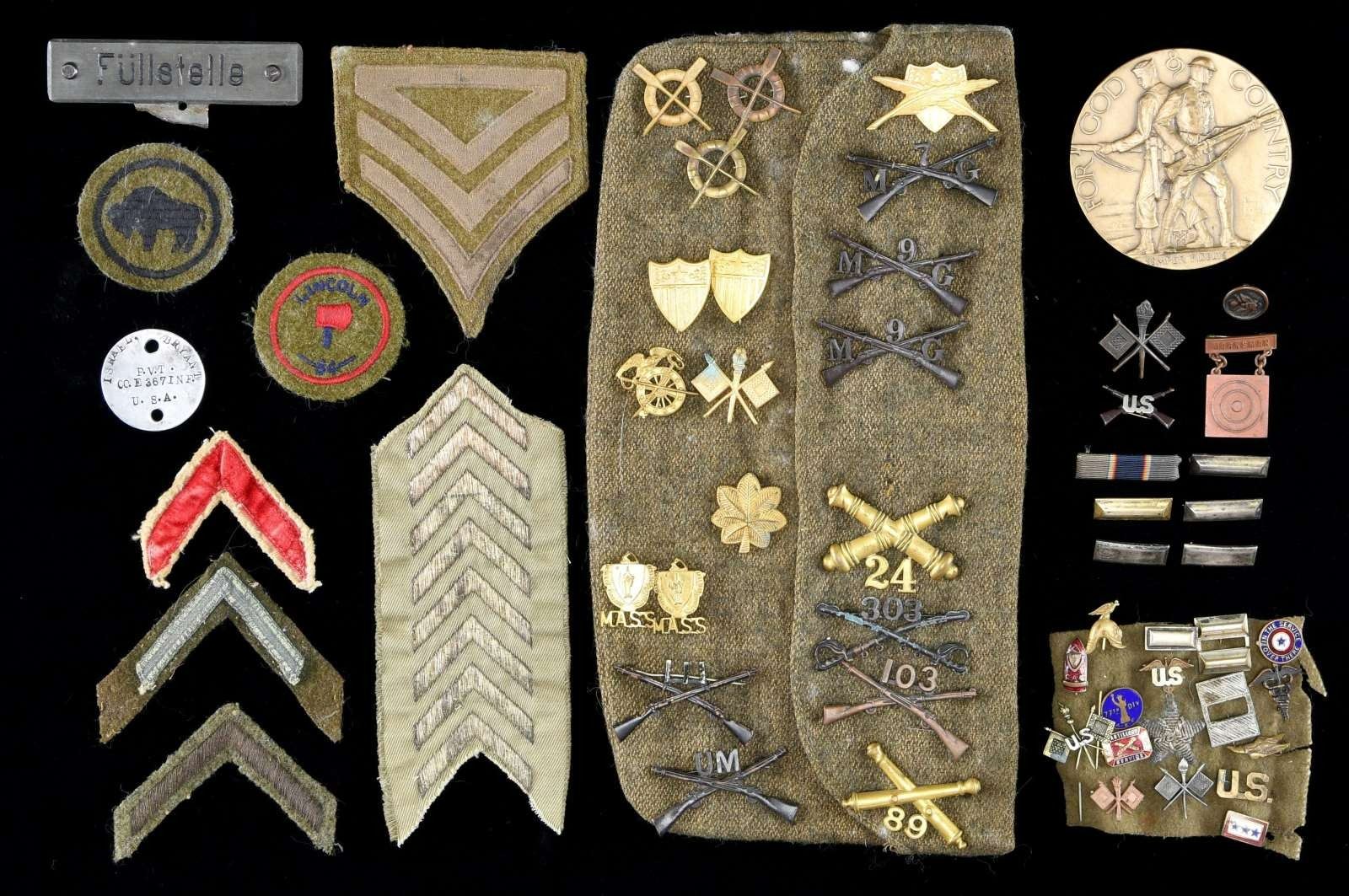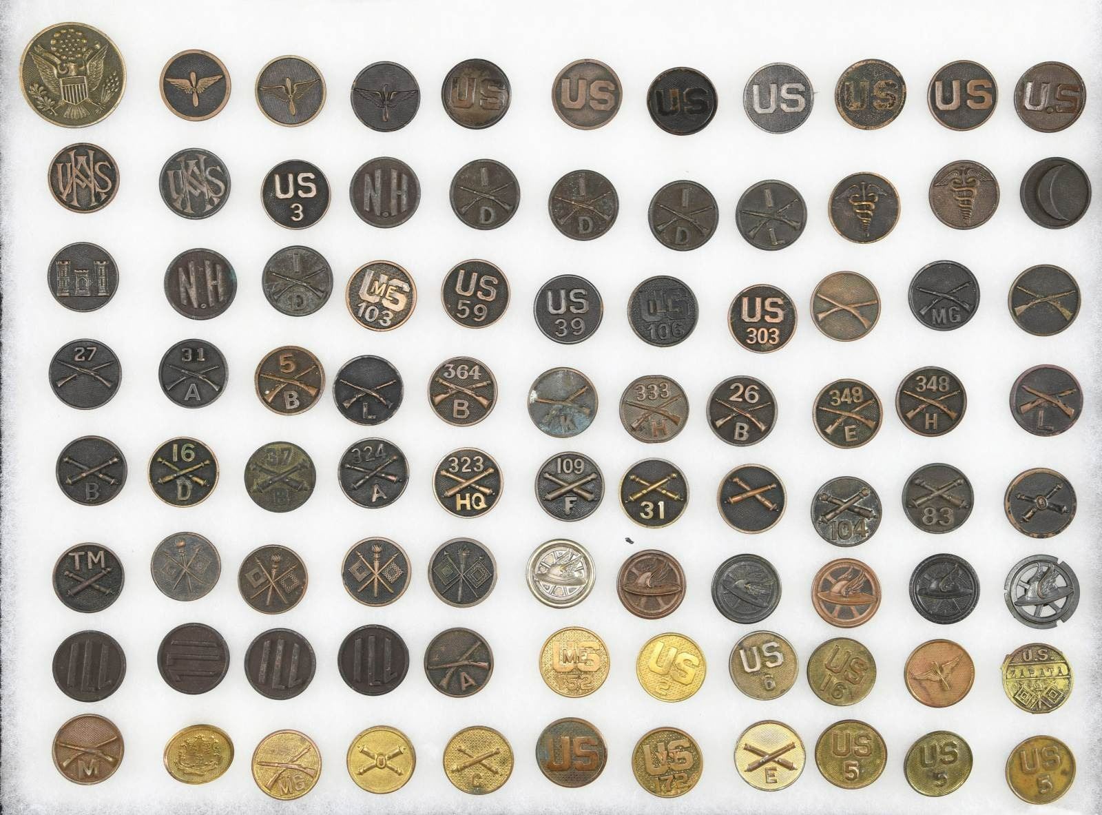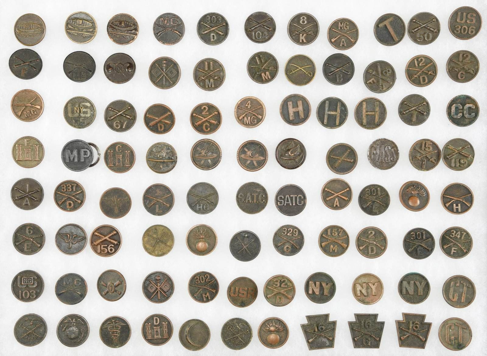 INSIGNIA & MORE. This large lot consists of approx. 353 collar discs dating from the WWI era to the mid-1920’s. There are a number of examples that just have a “US” on the front, but there are several scarcer examples, such as Machine Gun, Aero Squadron, Tank Corps, Trench Mortar, and one Marine Corps. The lot further includes a small group of officer’s insignia with a few pieces of rank insignia and two divisional patches. Also included is a case containing a Mills style belt buckle, WWI Victory Medal bars, a Spanish American War Veteran’s Medal, a GAR Medal, a CBI ID bracelet, and several other pieces of miscellaneous items. CONDITION: all items show light to moderate wear. Most collar discs have their screw-on nut on the reverse. (02-19503-1/BF). $1,400-1,800.