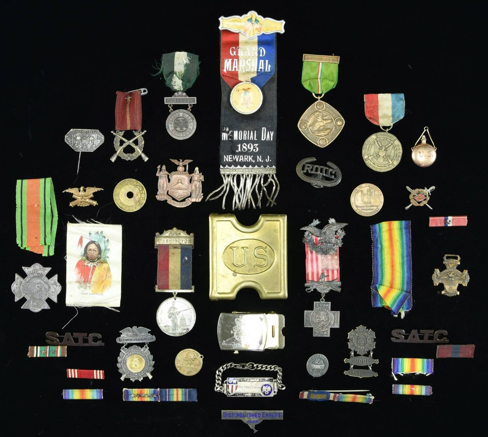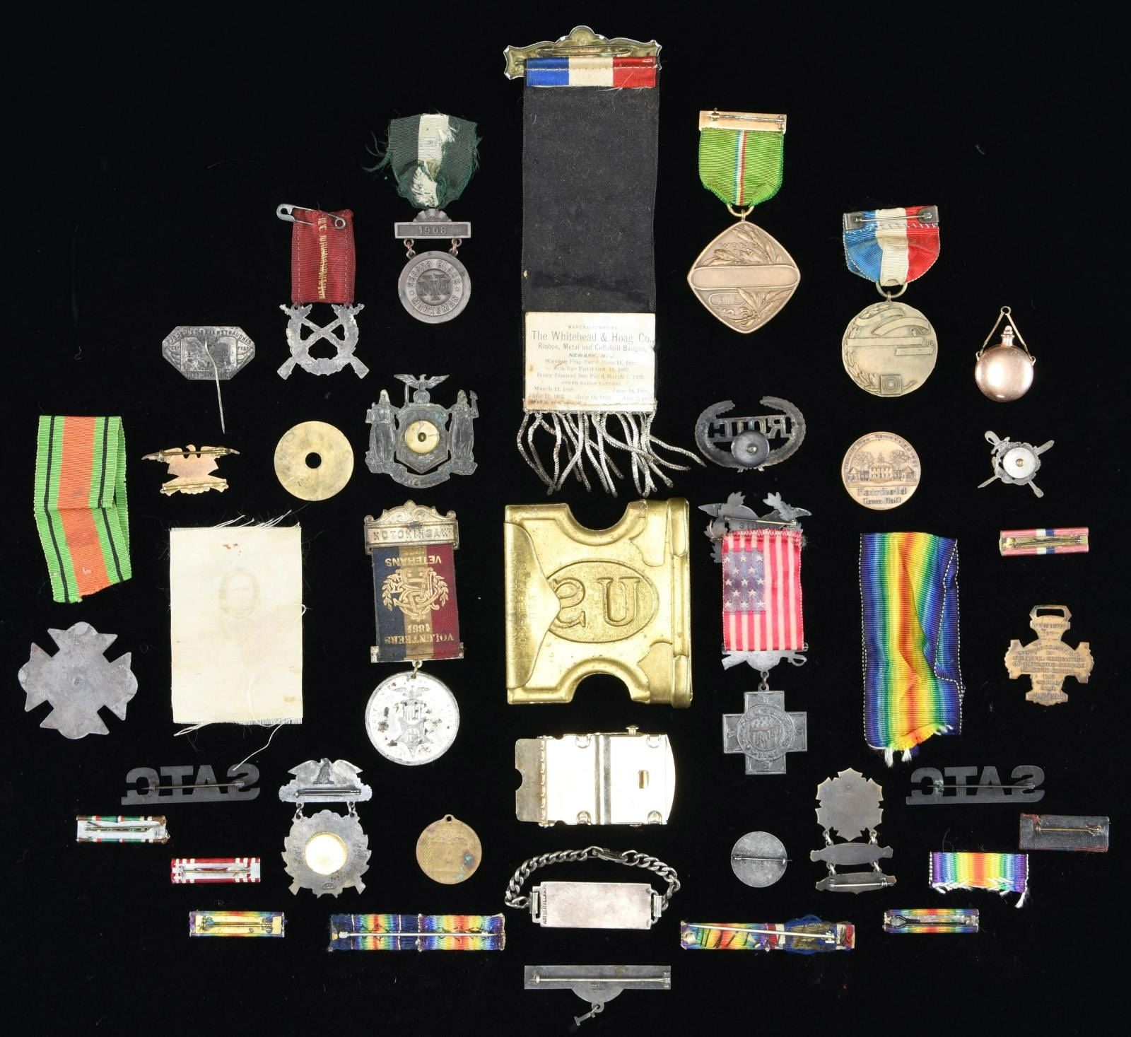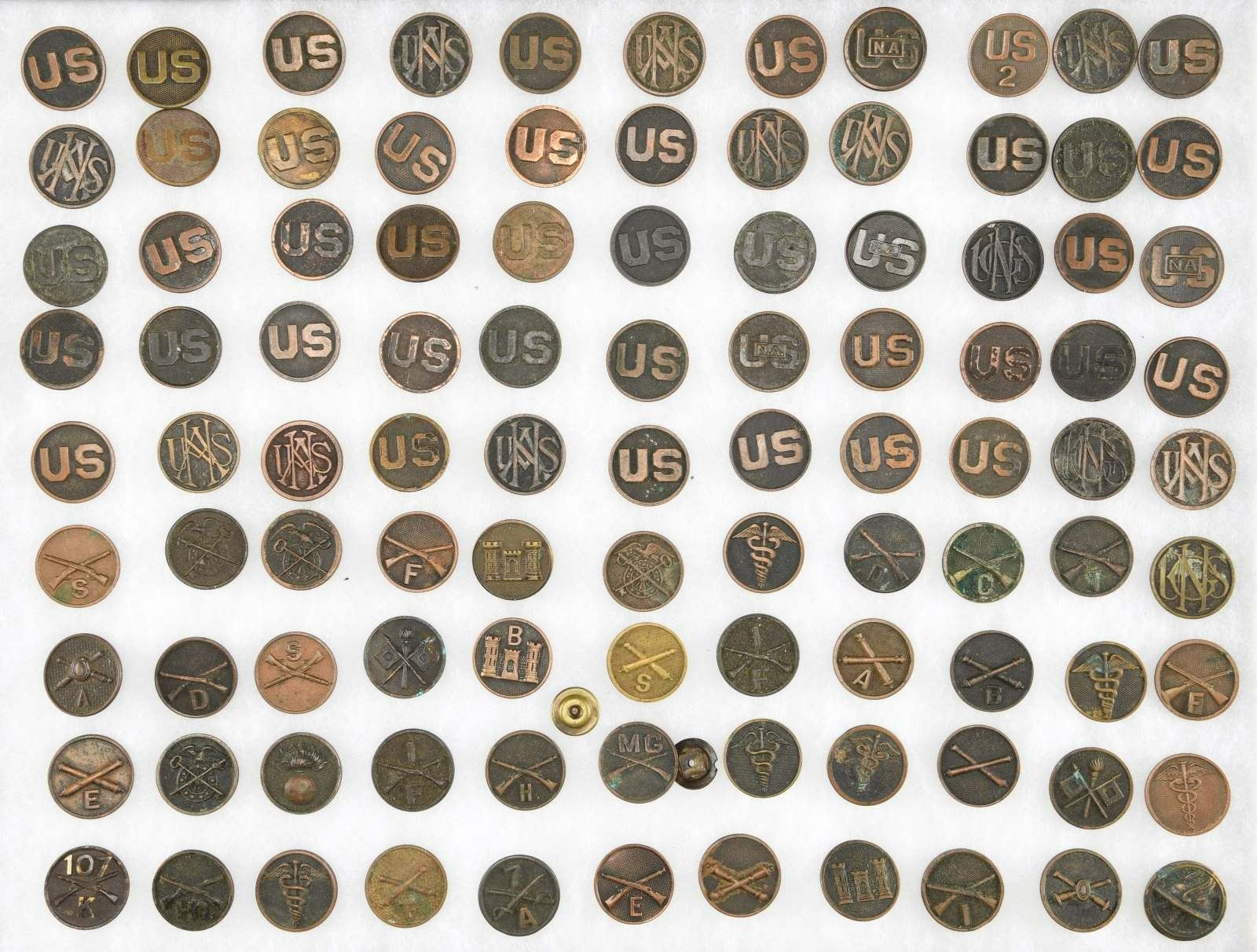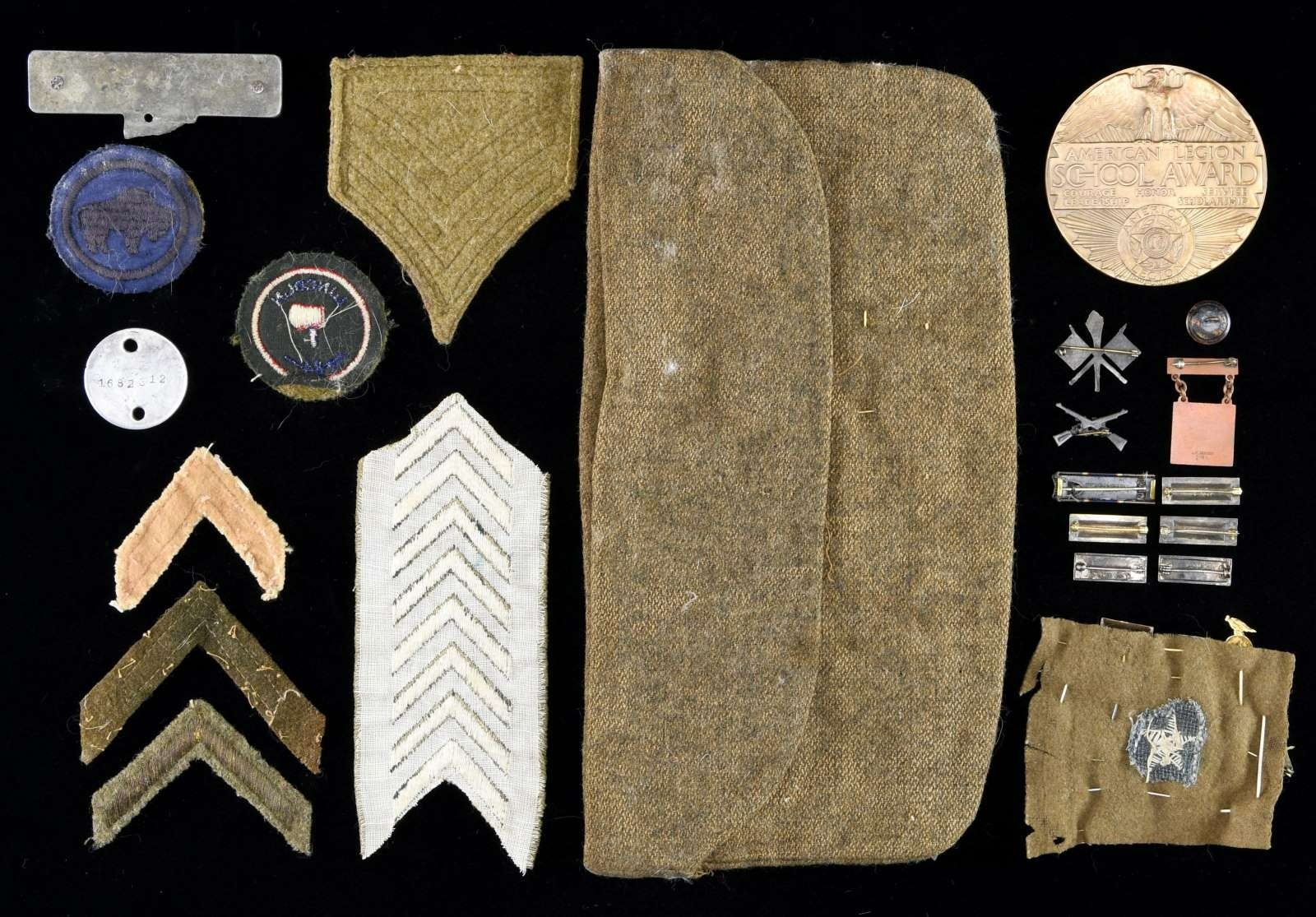 INSIGNIA & MORE. This large lot consists of approx. 353 collar discs dating from the WWI era to the mid-1920’s. There are a number of examples that just have a “US” on the front, but there are several scarcer examples, such as Machine Gun, Aero Squadron, Tank Corps, Trench Mortar, and one Marine Corps. The lot further includes a small group of officer’s insignia with a few pieces of rank insignia and two divisional patches. Also included is a case containing a Mills style belt buckle, WWI Victory Medal bars, a Spanish American War Veteran’s Medal, a GAR Medal, a CBI ID bracelet, and several other pieces of miscellaneous items. CONDITION: all items show light to moderate wear. Most collar discs have their screw-on nut on the reverse. (02-19503-1/BF). $1,400-1,800.