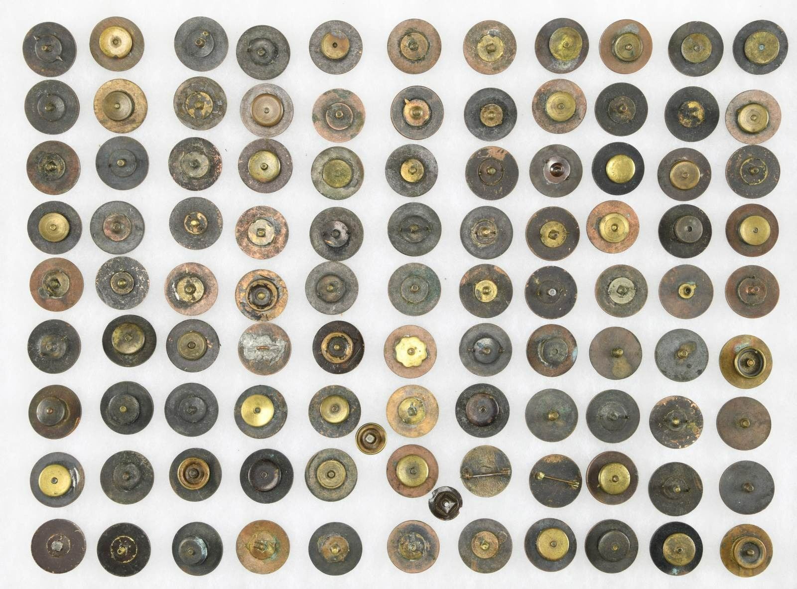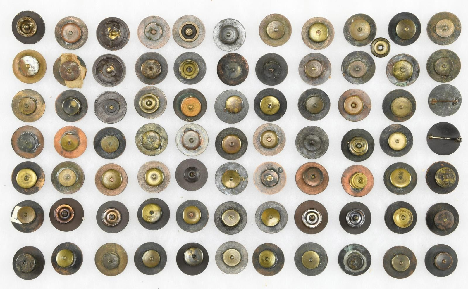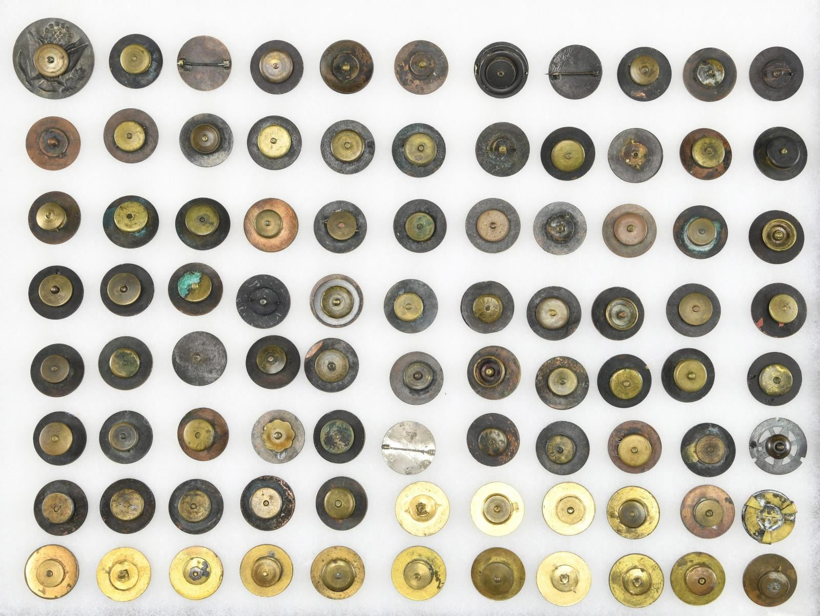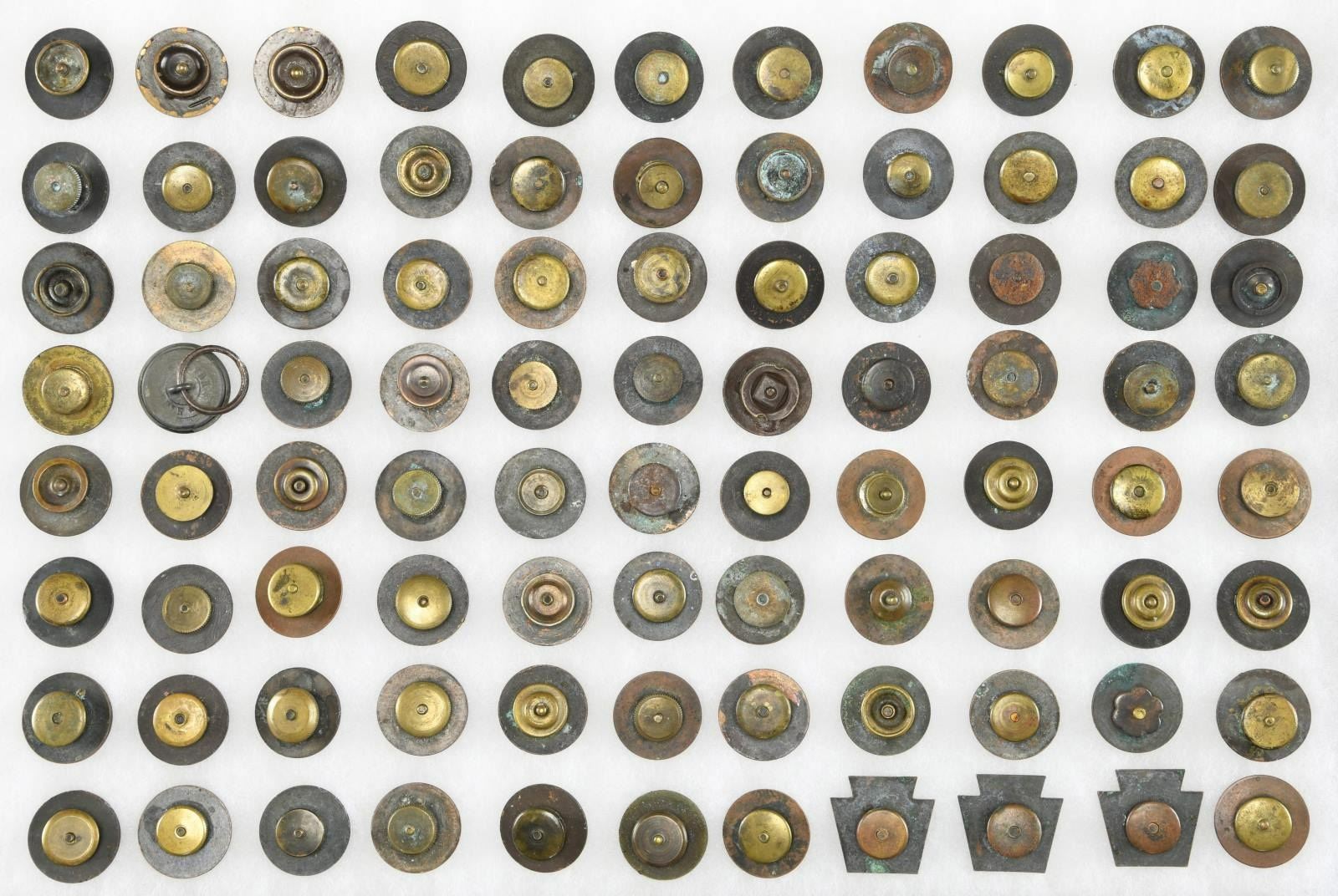INSIGNIA & MORE. This large lot consists of approx. 353 collar discs dating from the WWI era to the mid-1920’s. There are a number of examples that just have a “US” on the front, but there are several scarcer examples, such as Machine Gun, Aero Squadron, Tank Corps, Trench Mortar, and one Marine Corps. The lot further includes a small group of officer’s insignia with a few pieces of rank insignia and two divisional patches. Also included is a case containing a Mills style belt buckle, WWI Victory Medal bars, a Spanish American War Veteran’s Medal, a GAR Medal, a CBI ID bracelet, and several other pieces of miscellaneous items. CONDITION: all items show light to moderate wear. Most collar discs have their screw-on nut on the reverse. (02-19503-1/BF). $1,400-1,800.