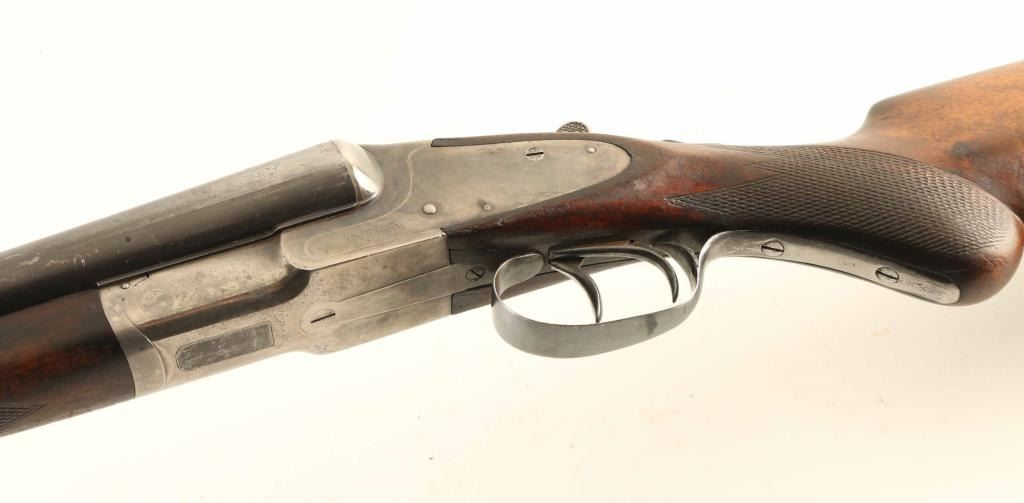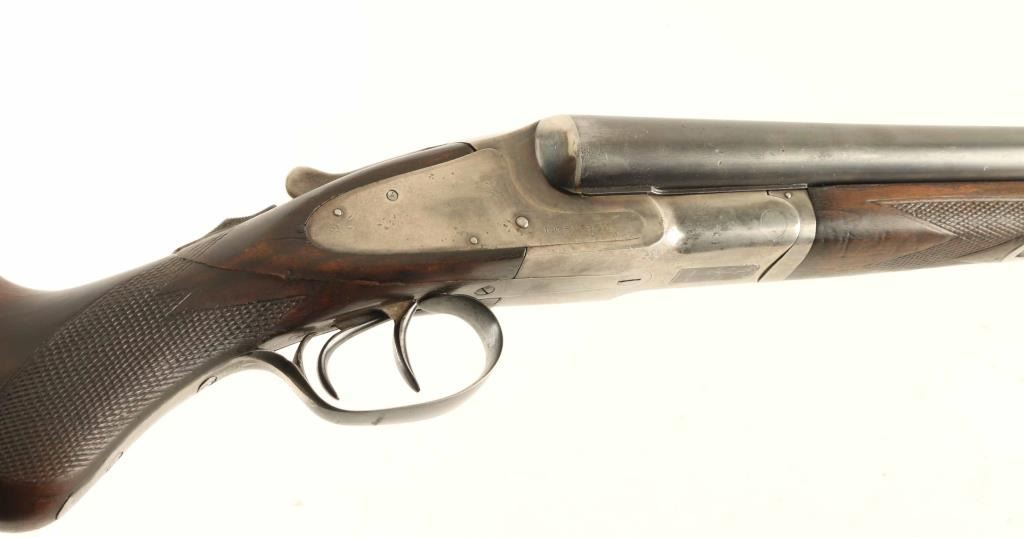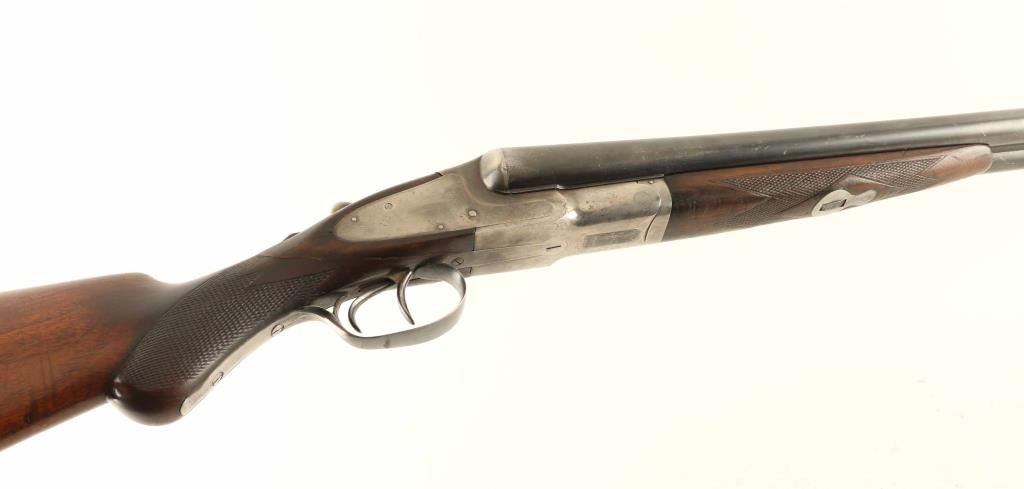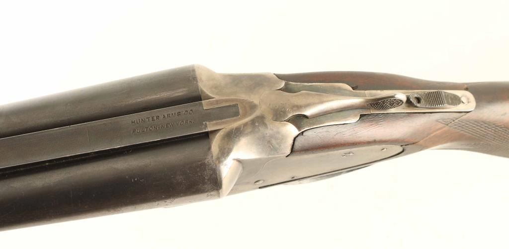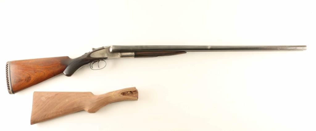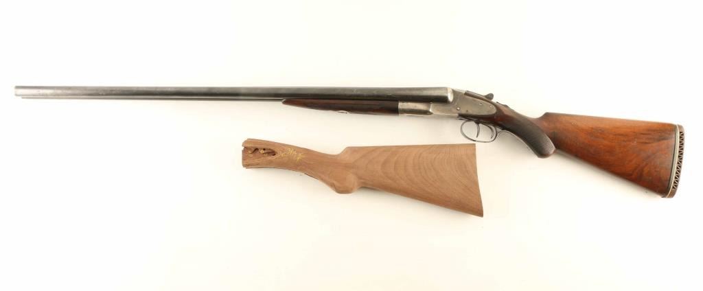 LC Smith side lock shotgun circa 1909 hammerless ejector, SxS 12 gauge. All numbers match. Grade OOE,The No.00 was the lowest grade of pre-1913 L.C. Smith shotguns. The catalog (1900) said: "A thoroughly reliable gun at a price within the reach of all. The new Armour Steel barrels are plain, but will stand the severest strain of nitro powder. English walnut stock; half pistol grip; checkered and well finished. (from the 1900 L.C. Smith catalog.) Marked on rib Hunter Arms Co. Fulton, New York. Brass bead front sight, tang safety, 2 triggers. Barrels show wear with scrapes, scuffs, some surface rust with minor pitting. Frames and lock plates are case hardened but not much color left. Locks up tight (cross bolt) Forend is good but butt stock has crack at tang on top of wrist. Comes with unfinished partial inlet butt stock. Nice project. Condition is NRA Fair to Good *** Modern Firearm ***