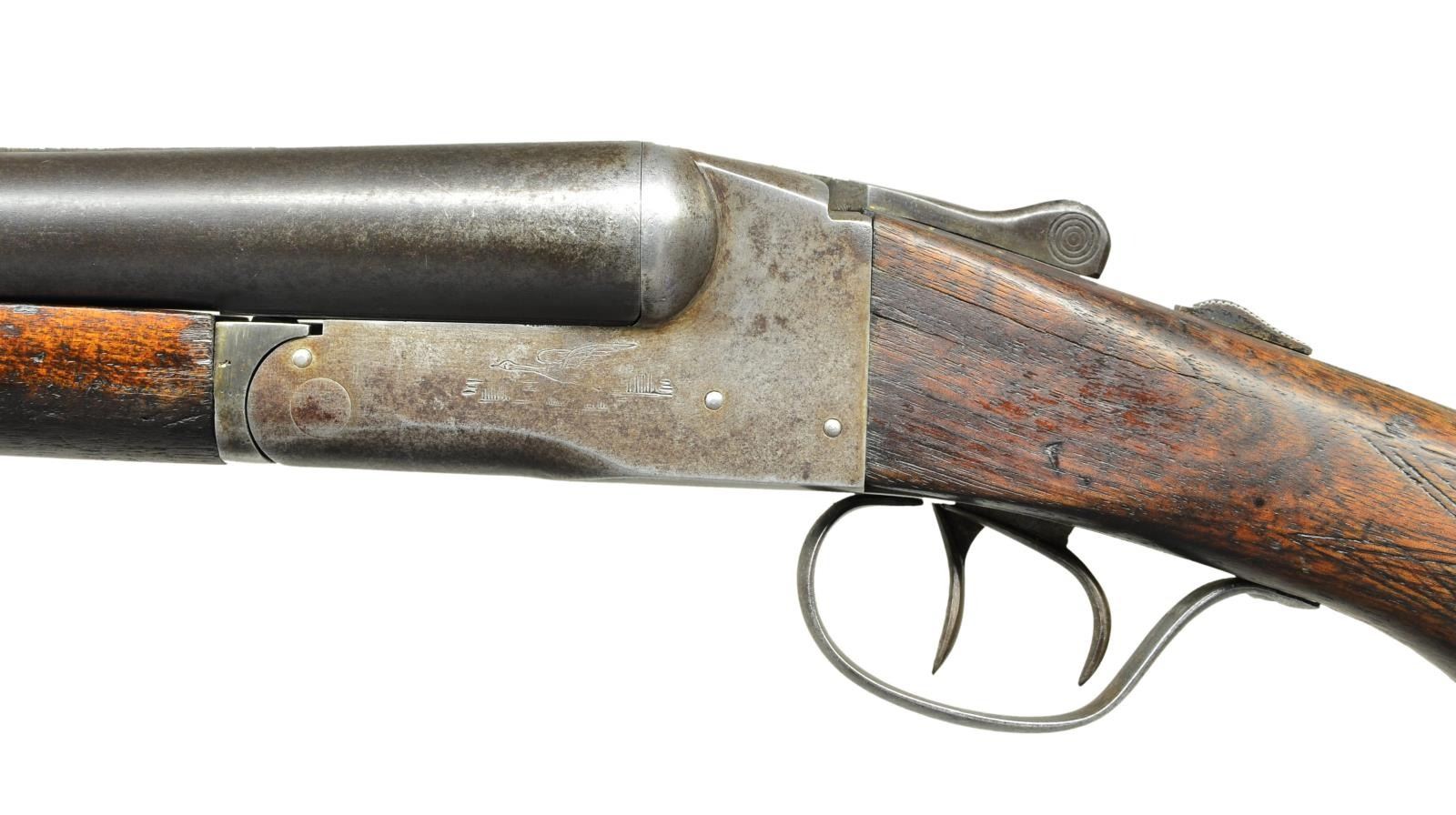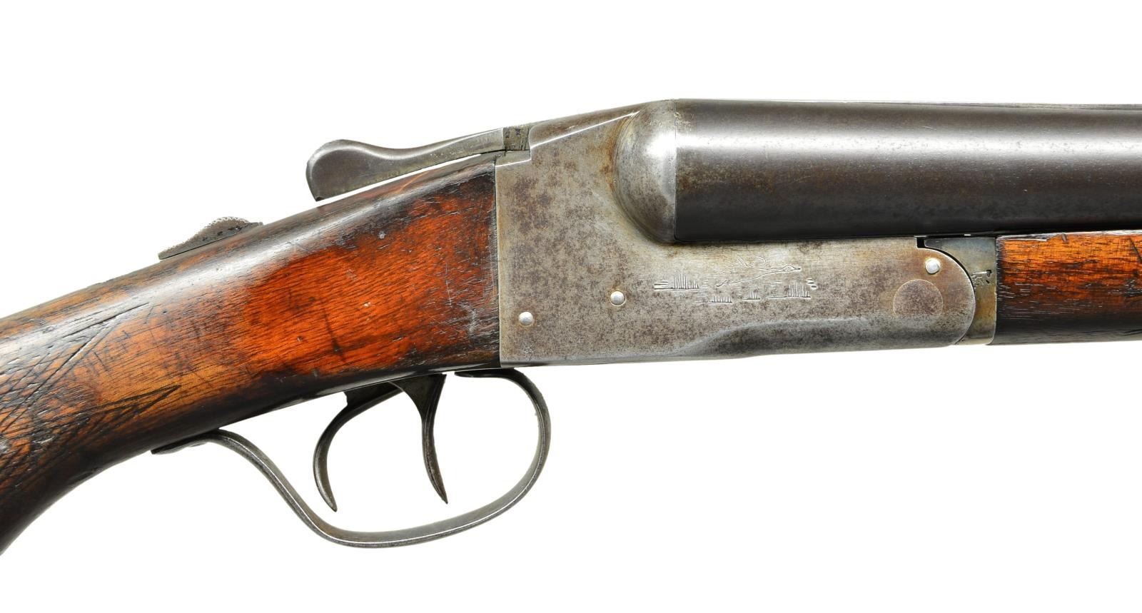 Cal. 12 Ga. S# 264729. Bbl. 28" matted rib choked “FULL” & “IM” w/ added red front bead. Matching S# on frame & bbls. Blued finish on bbls. w/ sides of frame lightly engraved w/ a duck in flight. Smooth forend w/ checkered capped pistol grip buttstock w/ 13" & 13 3/4" LOP to serrated buttplate. CONDITION: bbls. are a blue patina w/ frame a gray patina. Stock set shows heavy wear, sanded, dinged & dented w/ left wrist crack. Bores are quite bright w/ mild streaky residue & a few minor dents in right tube. (22-6216/CW). CURIO. $200-300.
