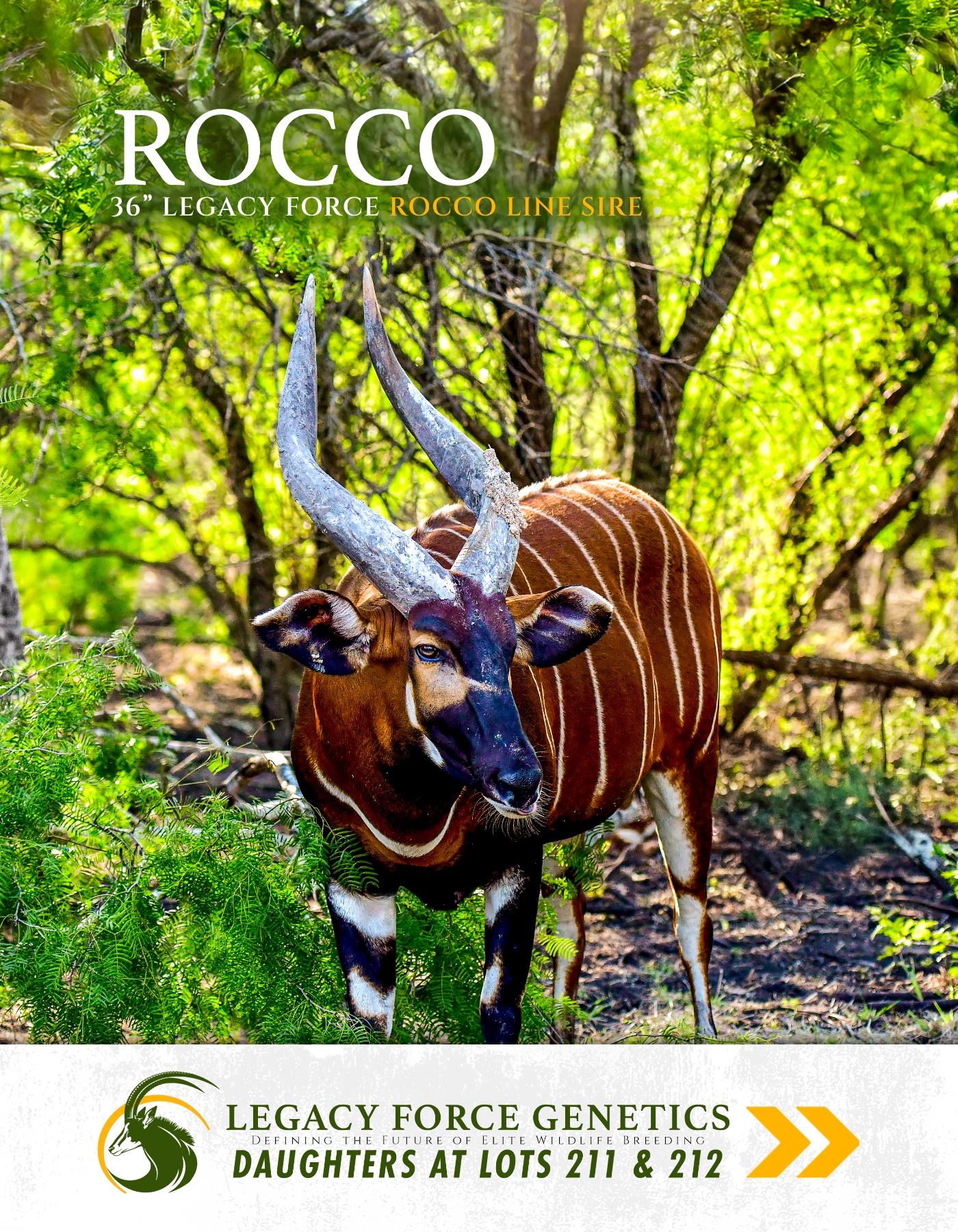 0.1 Yearling Bongo sired by 36" Rocco, Legacy Force Rocco line sire. Raised on 100 acres from our Pettus ranch. Rocco has transitioned to private ownership, these will be some of the final Rocco daughters WLP will have to offer. Tag Yellow 69. This is an exact photo of the animal you will receive. Born 3/2025.