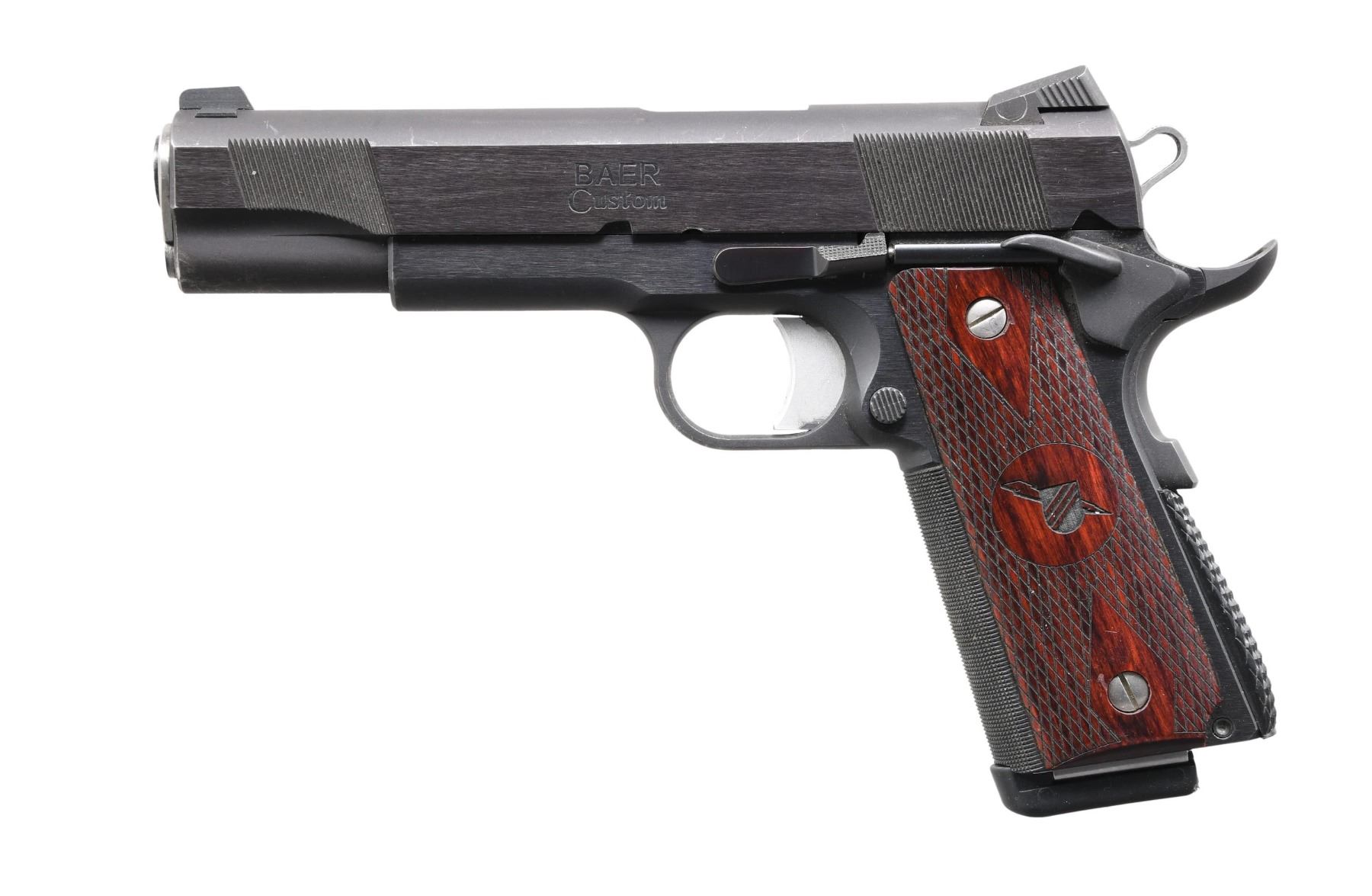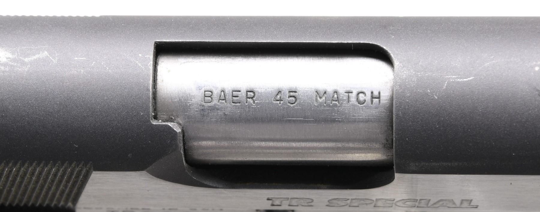 Cal. 45 ACP. S# TR03345. Bbl. 5". Three-dot Trijicon night sights. Thunder Ranch special 1911-style pistol made by Les Baer. Slide has front and rear serrations. Right side of slide marked "TR SPECIAL" and with Thunder Ranch logo. Extended beavertail grip safety. Front and backstraps are checkered. Extended right-hand safety. Blued finish. Thin hardwood checkered grips with Thunder Ranch logo. MAGS: four 8-rd. Three of the mags are of Korean mfg., and one is of Chip McCormick mfg. CONDITION: grips show a few light handling marks. Metal retains 90% original blue with a sldie stop reassembly scratch on the left side of the frame and scattered edge & handling wear. Action functions properly when hand-cycled. Very good+, bright bore. (24-1291/MJC). MODERN. $1,800-2,200.
