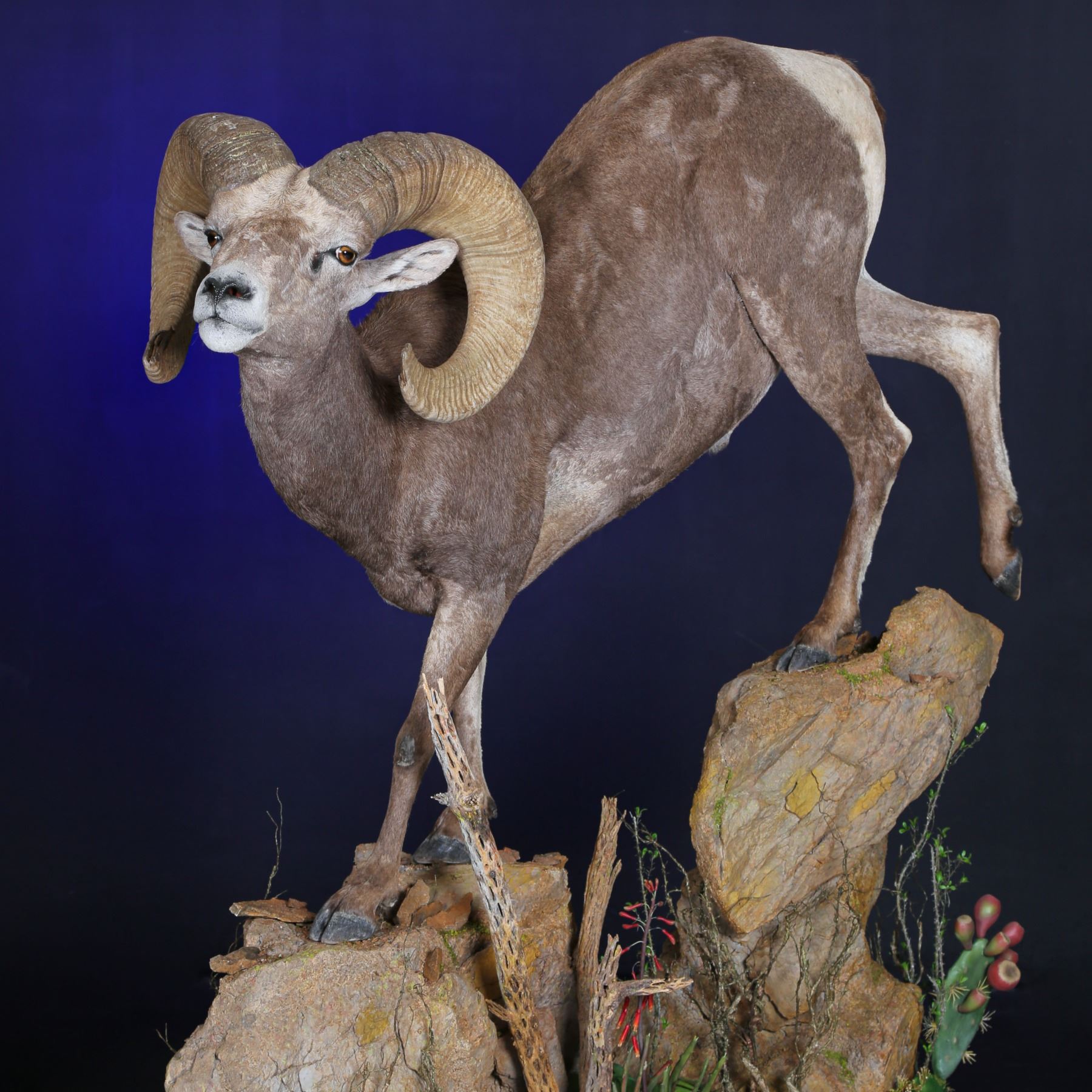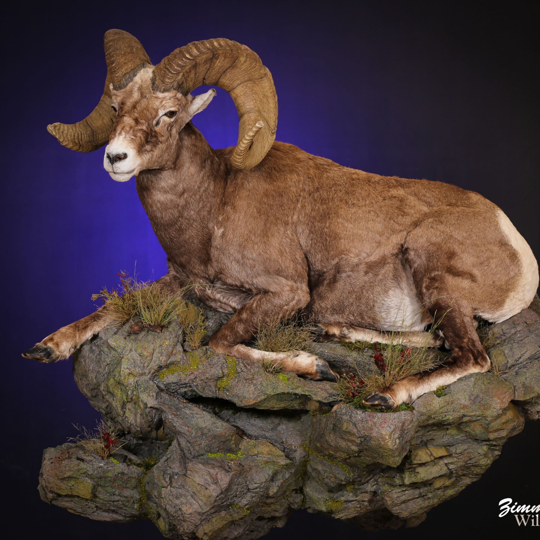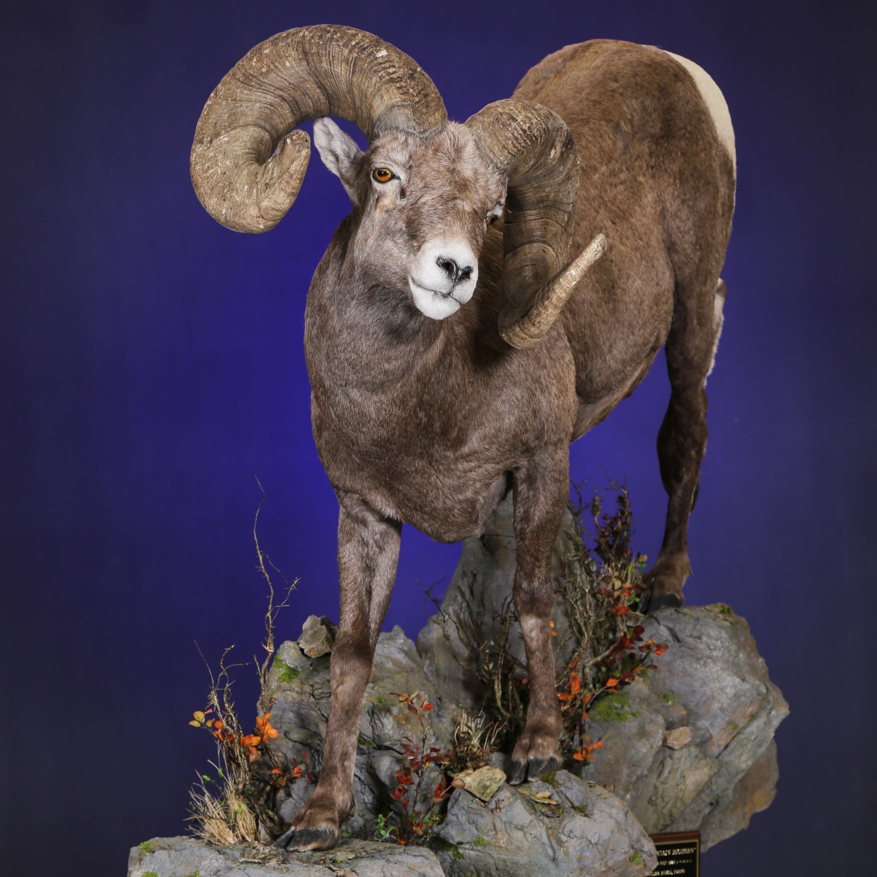 DONATION: This is a life-size Wild Sheep mount, custom design to purchasers’ desired pose, complete with a standard 10” hardwood base with appropriate habitat.