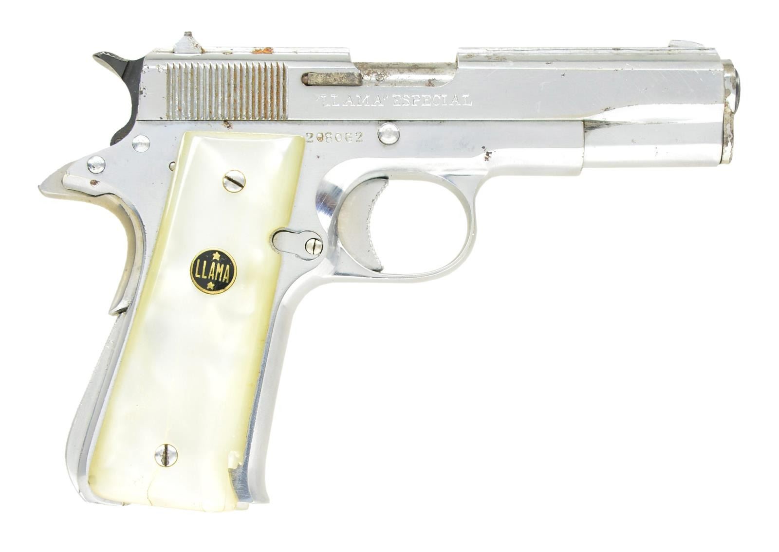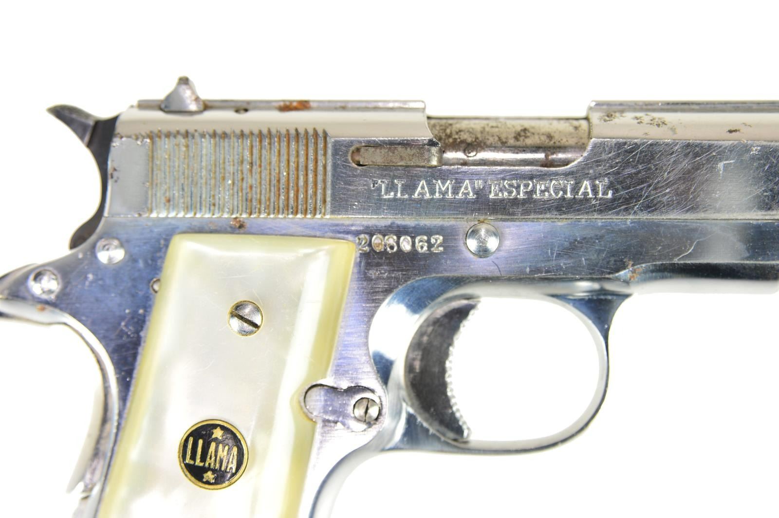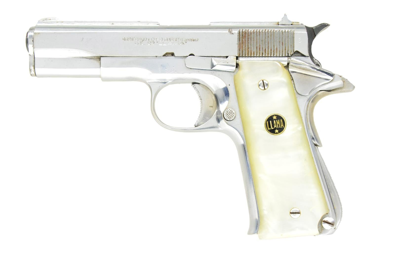 Cal. 22 LR. S# 208062. Manufactured 1958; date code D1. Bbl. 3 1/2". Square notch rear sight. Ramped blade front sight. Chrome finish w/ blued hammer. Imitation pearl grips w/ Llama logo. MAGS: none. CONDITION: right grip panel shows a chip at front & a few cracks. Grips otherwise show some staining, dings & handling marks. Metal retains 85% chrome finish w/ a few small spots of light pitting, scattered scratches & flaking. Good bore w/ some light pitting near muzzle. (22-4857/MJC). CURIO. $150-250.