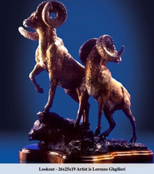 This limited edition bronze statue by renowned artist Lorenzo Ghiglieri depicts two bighorn rams proudly standing as sentinels on the mountain.