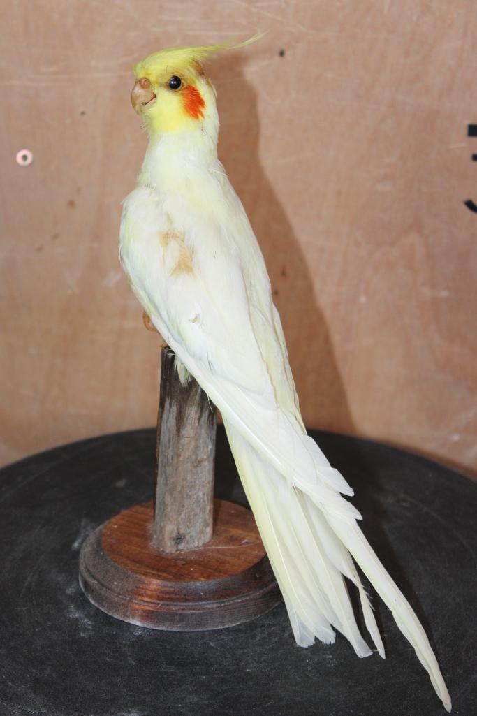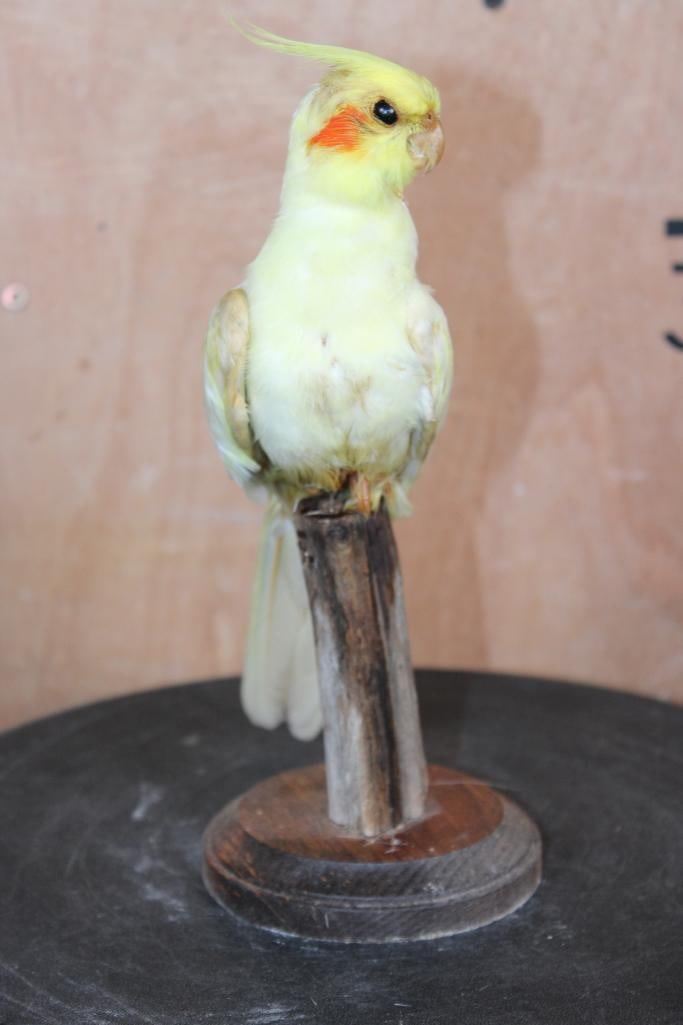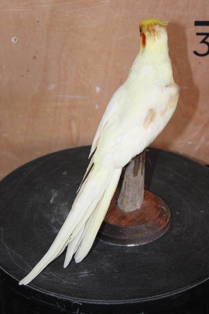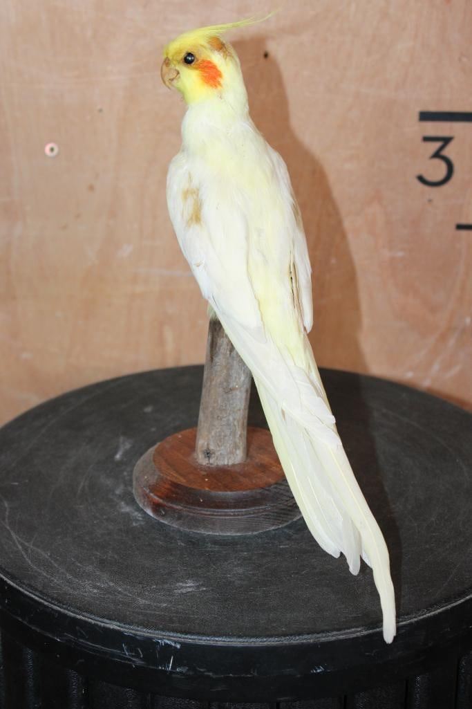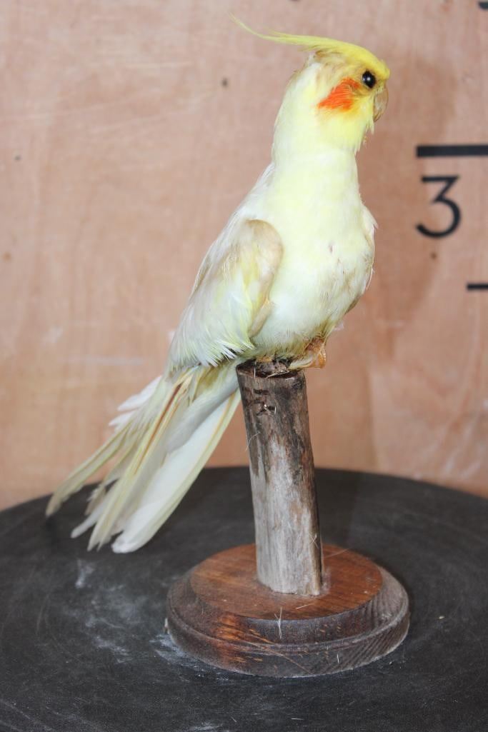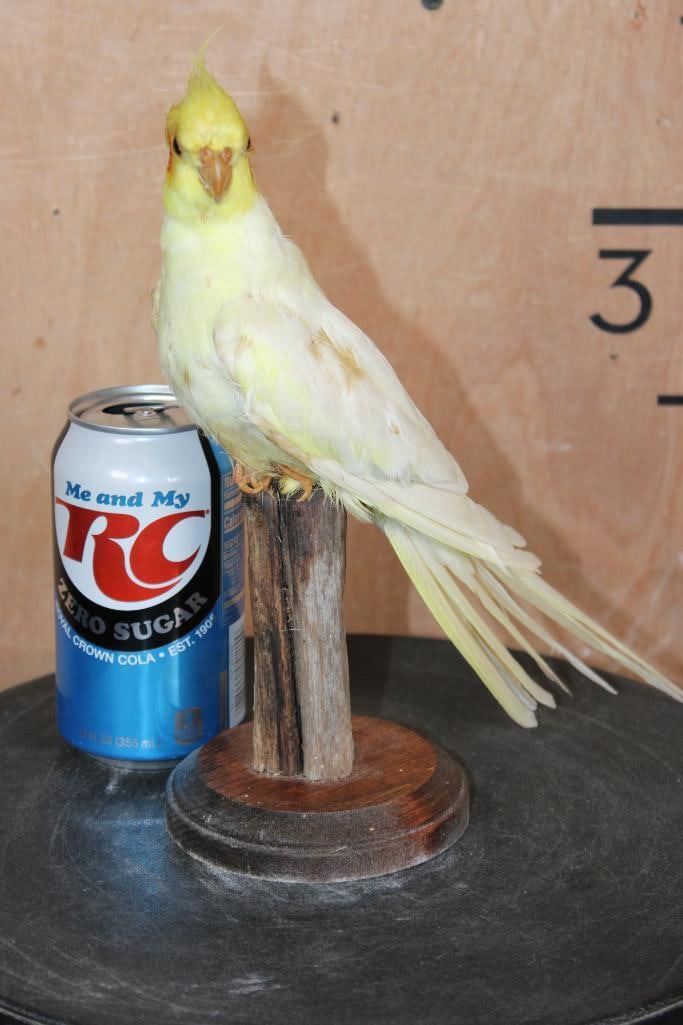 Beautiful Life-sized LUTINO COCKATIEL Perched on a Wood Base. It measures 8.5" Long x 4" Wide x 10" Tall and is in Good Condition. TAXIDERMY BIRDS