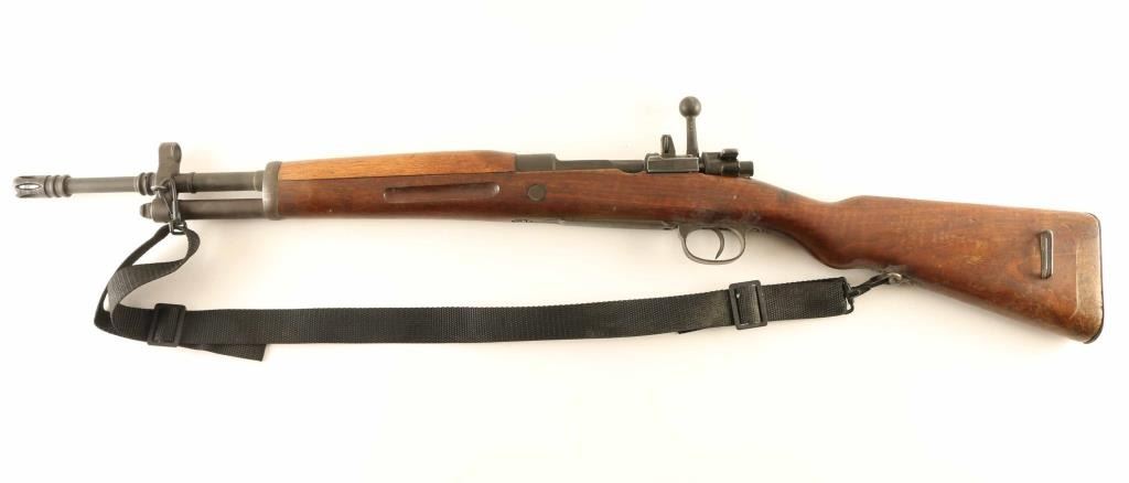 Spanish military rifle chambered for the 7.62x51mm cartridge, imported by C.A.I. St Albans VT. Barrel length is 18.5 inches. Features a peep rear sight and flash suppressor. Metal finish is 95% coverage dark grey parkerizing, with a hint of brown color throughout. Bare metal showing on sharp edges. Stock is overall very good condition with moderate denting around wrist; roughness and loss of finish near buttplate. Bore is excellent. Sling swivels on side. Includes an excellent condition black nylon military style sling. All observed numbers match. Condition is NRA Very Good ***C&R Firearm***