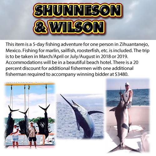 This item is a 5-day fishing adventure for one person in Zihuantanejo, Mexico. Fishing for marlin, sailfish, roosterfish, etc. is included. The trip is to be taken in March/April or July/August in 2018 or 2019. Accommodations will be in a beautiful beach hotel. There is a 20 percent discount for additional fishermen with one additional fisherman required to accompany winning bidder at $3480.