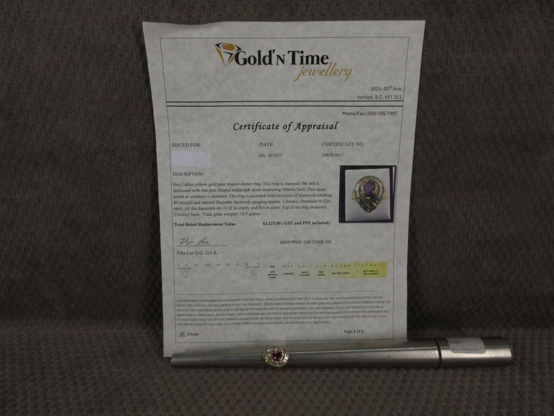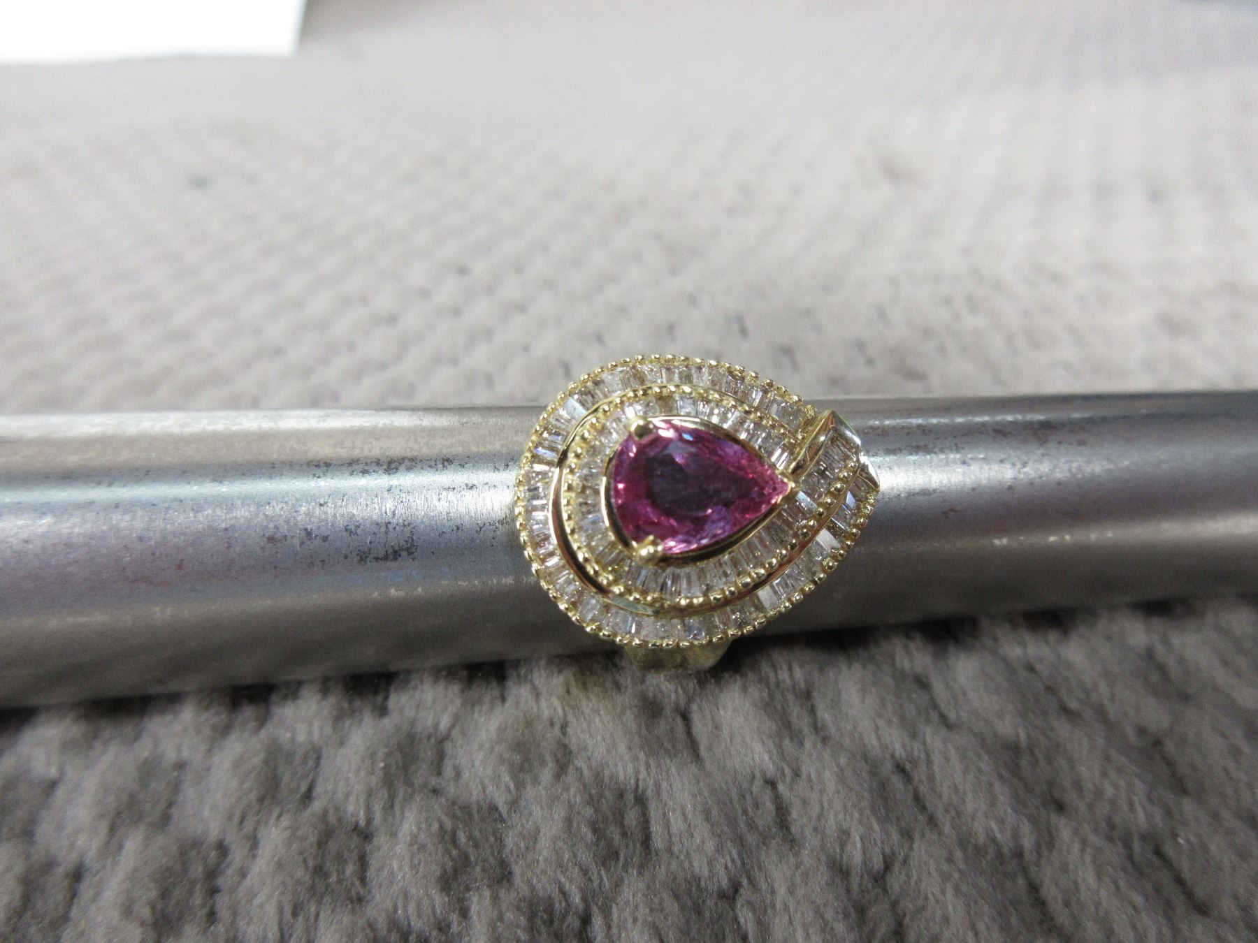 Ladies 18 K Dinner Ring With Pear Shaped Stone surrounded by two rows of diamonds Comes with 2017 Appraisal