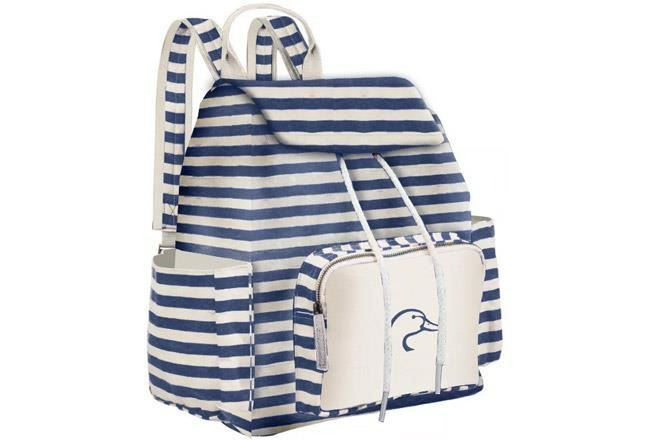 This navy and cream cotton canvas backpack is a perfect carryall for your outdoor fun. Features two adjustable shoulder straps, a carry handle, drawstring closure, and an embroidered DU logo on the front. Includes a main compartment, two interior pockets, two exterior side pockets and a front zippered pouch. Privacy flap secured with magnetic snap. 11”x 15”x 4 3/4