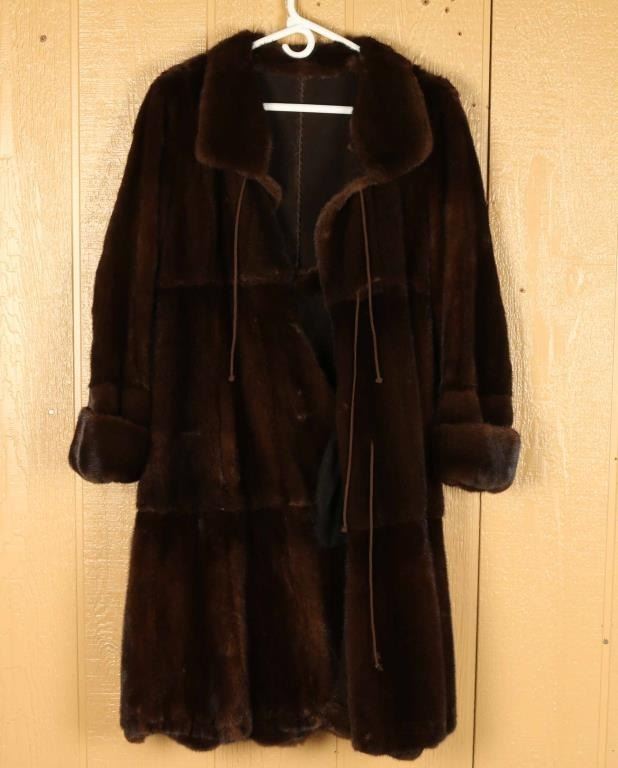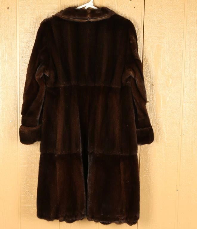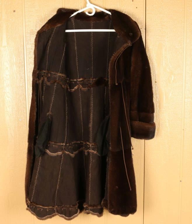 Chocolate brown fur, rolled cuffs suede lined. Overall length is 39", sleeves 22" long, 17" across shoulders. In mint condition ladies Medium. Simply stunning coat would be 3000+ in a store.