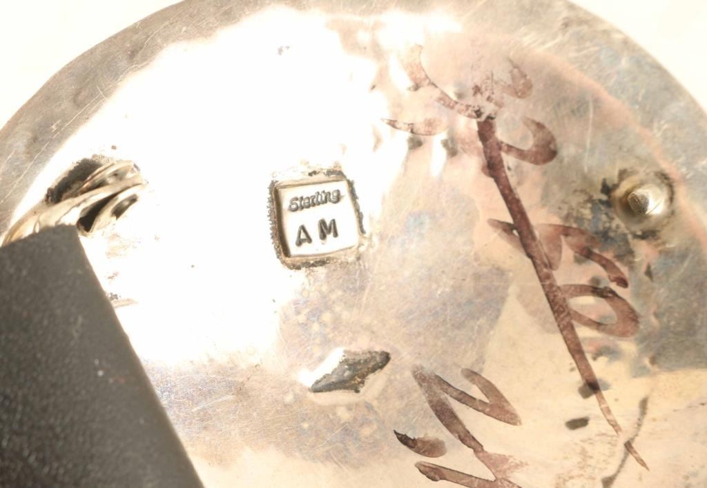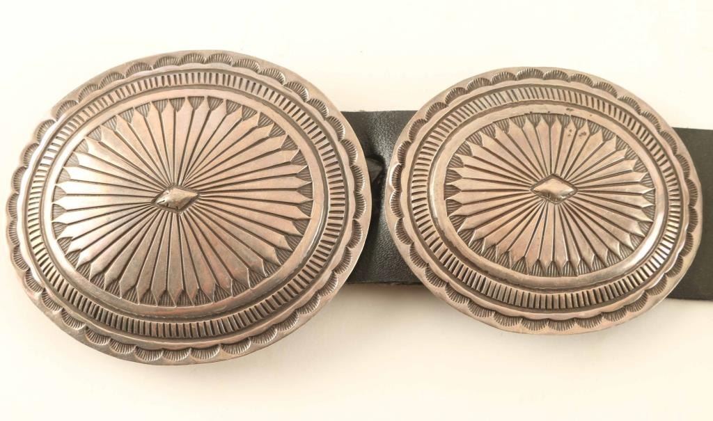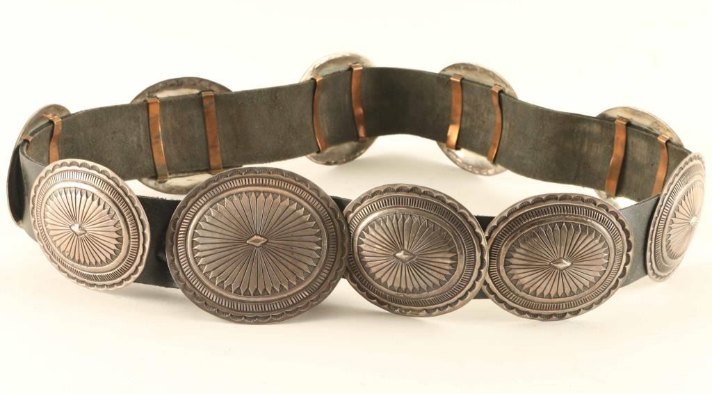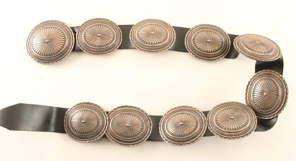 with (10) traditional sterling silver conchos. Maker marked "AM". Belt measures 41 1/2" end to end.