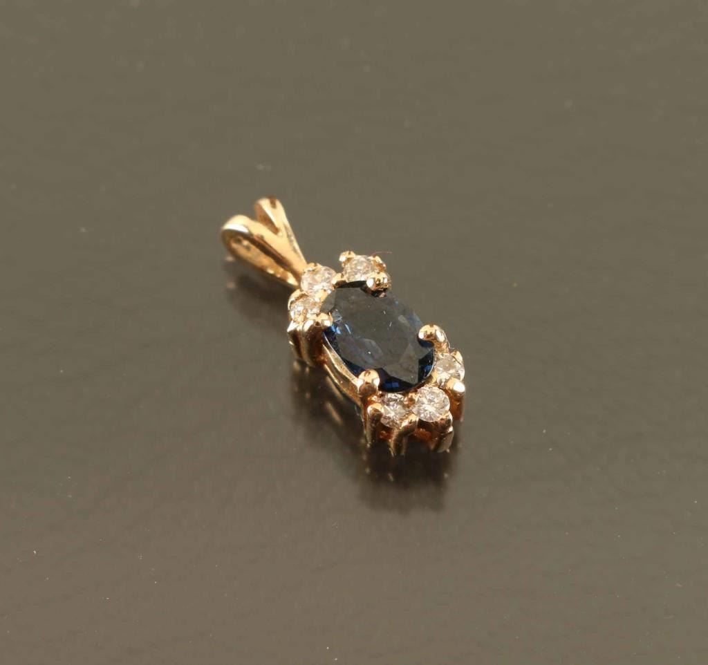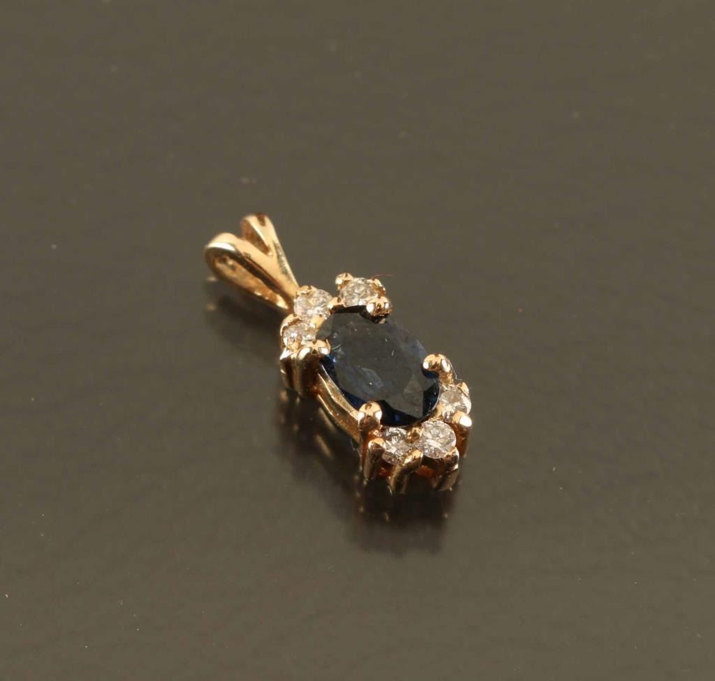 Oval shaped sapphire surrounded by 6 diamonds set in yellow gold.