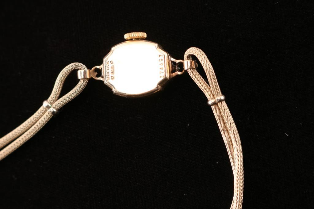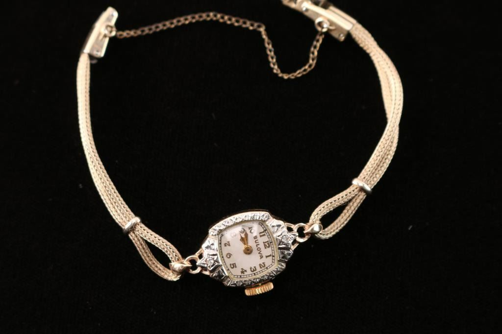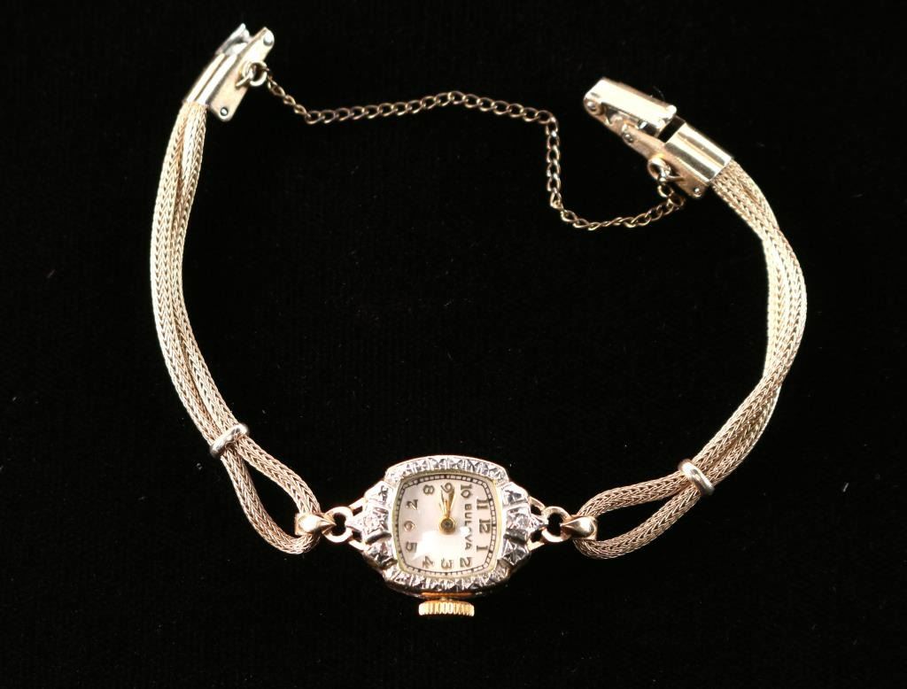 In 14k gold in bracelet style band with watch face surrounded by a diamond halo diamonds. Measures 6" around.