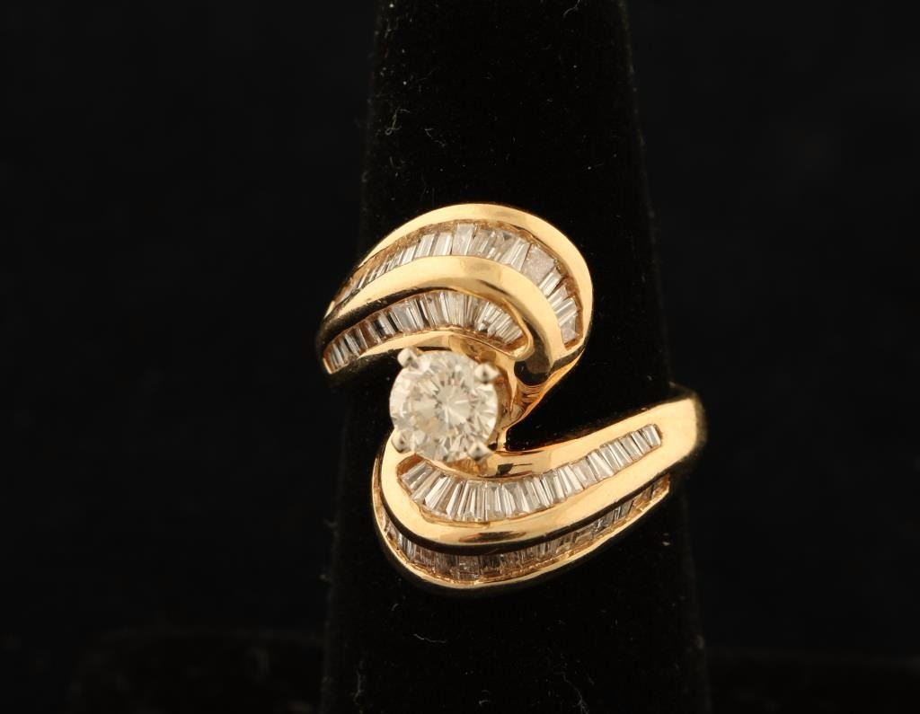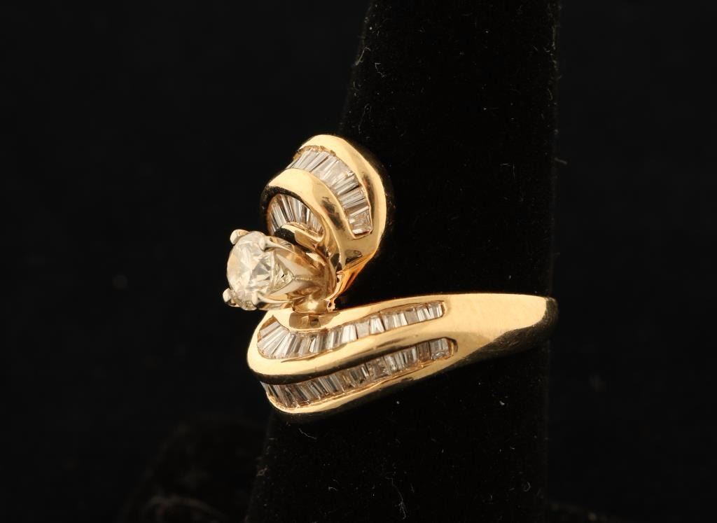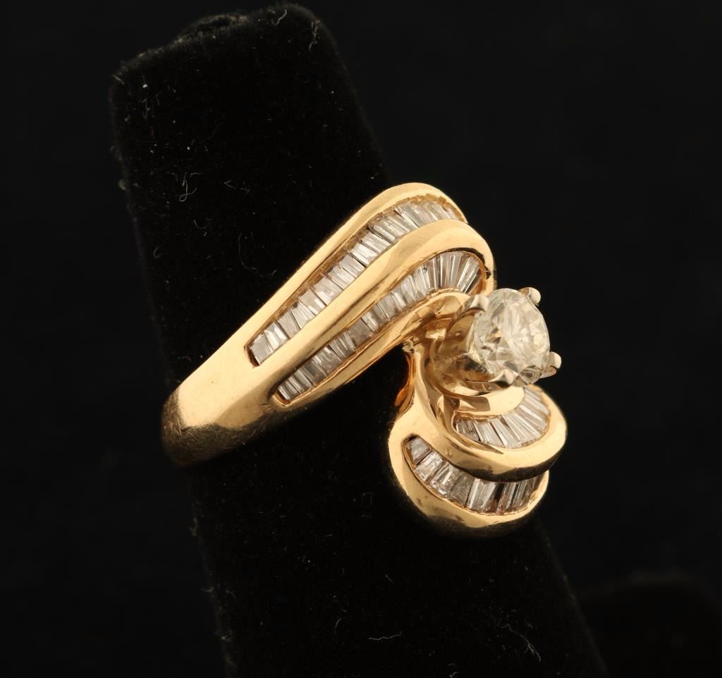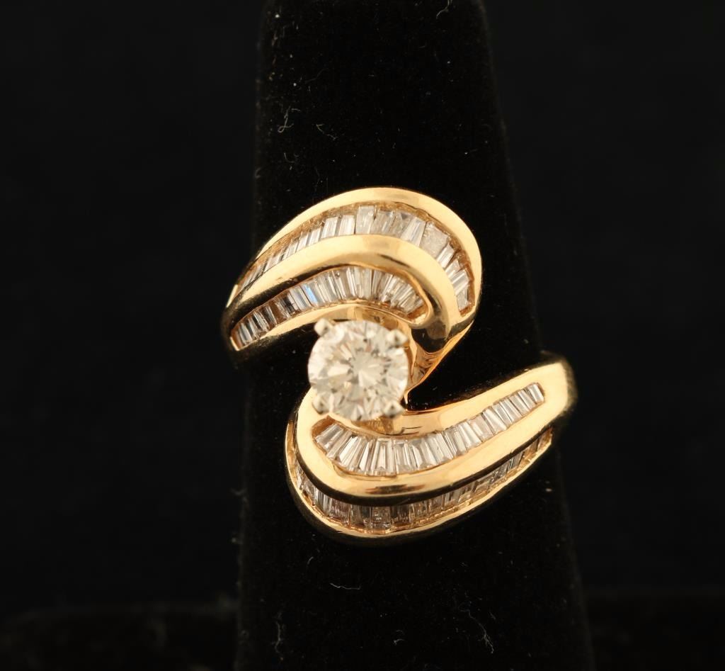A swirl design set with baguettes in 14K yellow gold surround a half carat diamond. Very unique presentation.