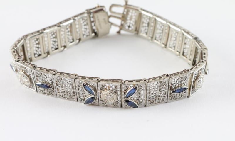 accented with synthetic sapphires, 3 old European cute diamonds and eight marquise shaped synthetic sapphires set in white gold. Includes appraisal from Elite Jewelry Appraisals in Tustin California.