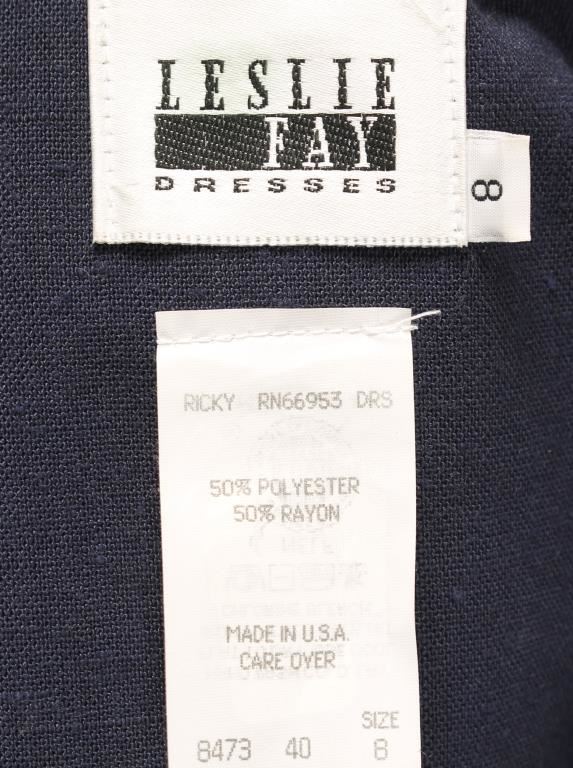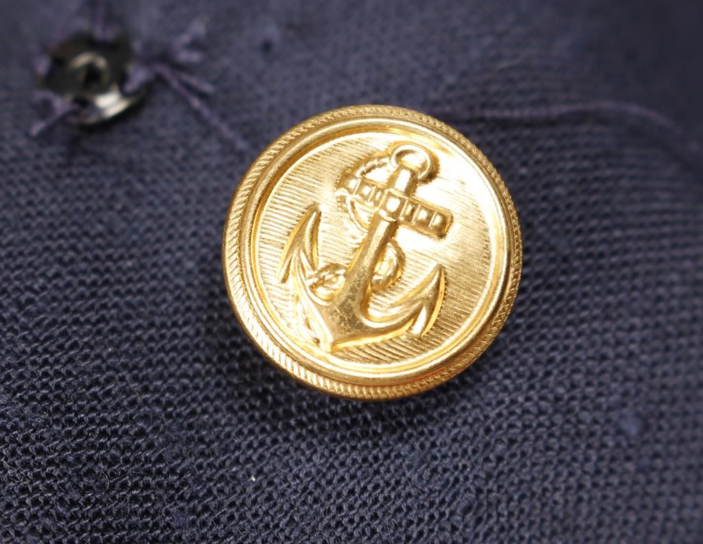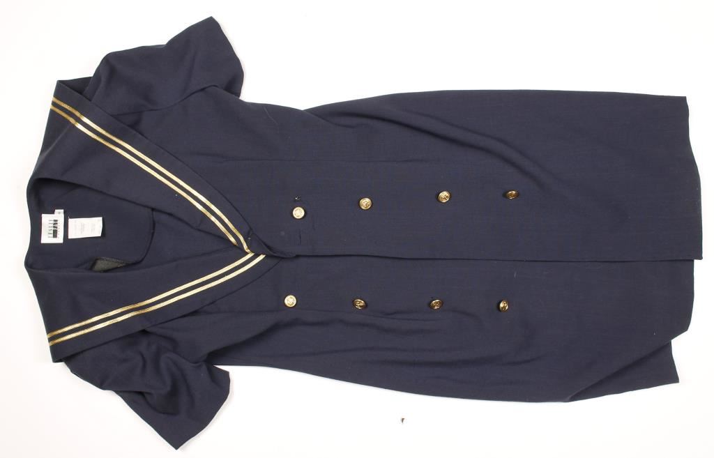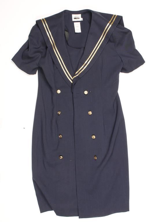 Navy with gold details around lapels and back sailor flap. Gold metal buttons with anchors on them. Made by Leslie Fay Dresses size 8.