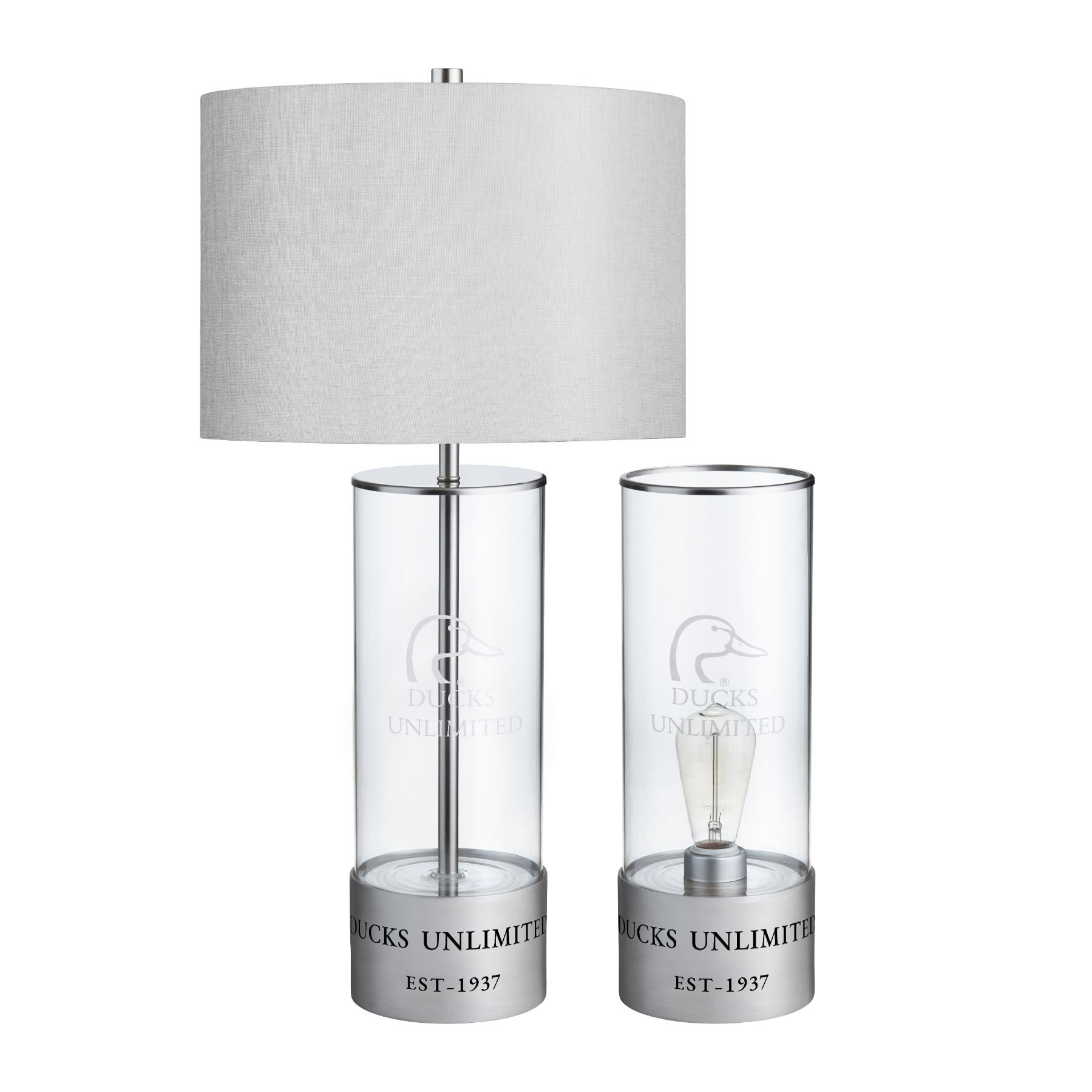 Enhance your home décor with the stylish Lamp Set, which includes a table lamp and a coordinating accentlamp. Both lamps feature a clear glass base elegantly etched with the DU logo, adding a touch of sophisticationto any room. The table lamp stands 29.5” tall and comes with a chic gray linen shade, perfect for providingambient lighting. The accent lamp, designed with the same elegant elements, includes an LED industrial lightbulb andmeasures 16”, offering a modern touch. This matching set is ideal for elevating the aesthetic of yourhome.