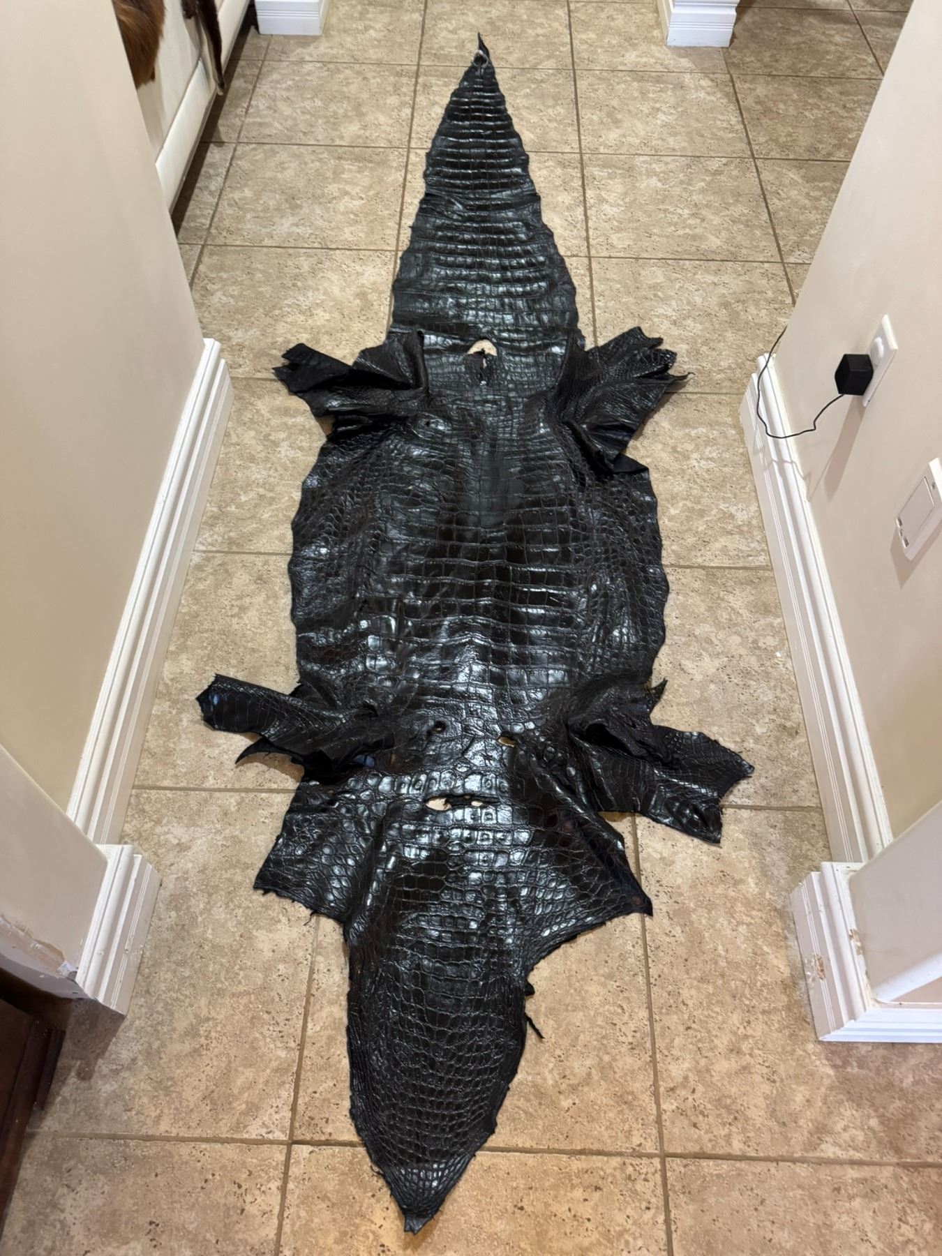 Description: Harvested from Southern Louisiana and professionally skinned, tanned, and dyed this American Alligator hide is a must have to add to your collection. The perfect material to create whatever leather goods you would like or simply to add a trophy or decoration to your home. Soft tanned with a velvet like finish on the underside, this is a stunning conversation piece. Tanned gator leather hides are perfect for upholstering luggage, furniture, seats, or any item you can dream up! Turn this hide into stunning custom leather alligator boots for $1000. We also have additional hides available to purchase if you need more in bulk! Shipping is not included in this package! Exact hide is pictured here.