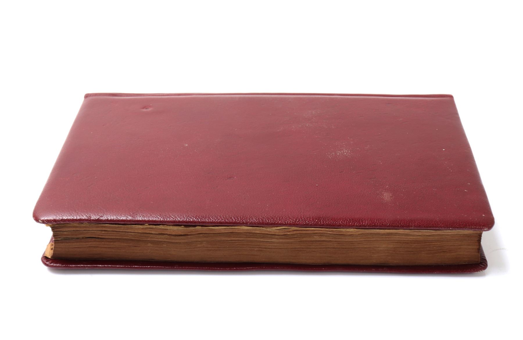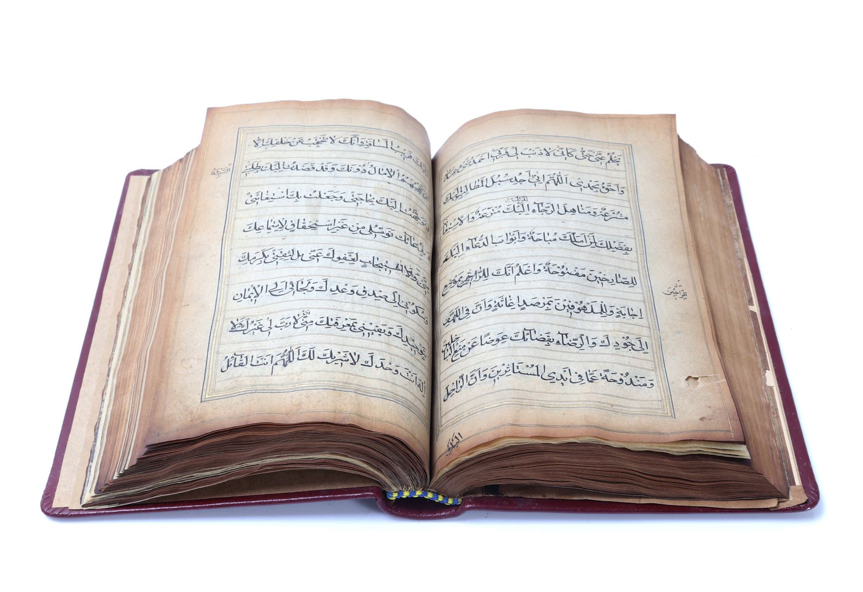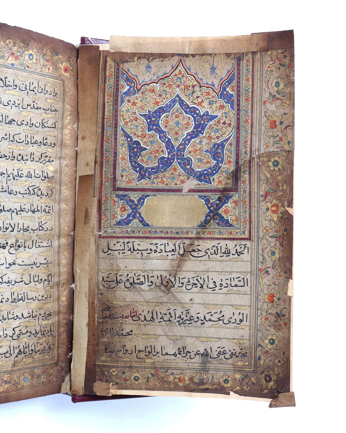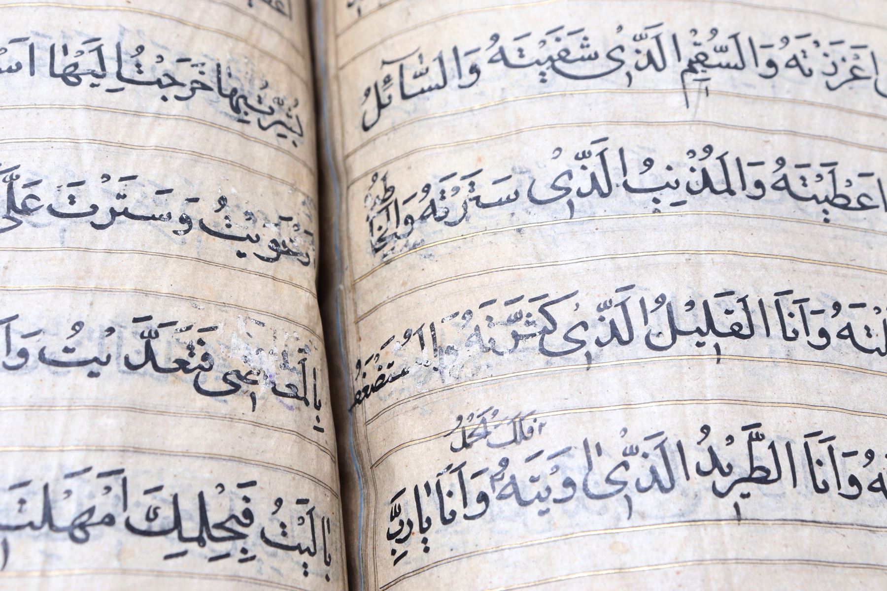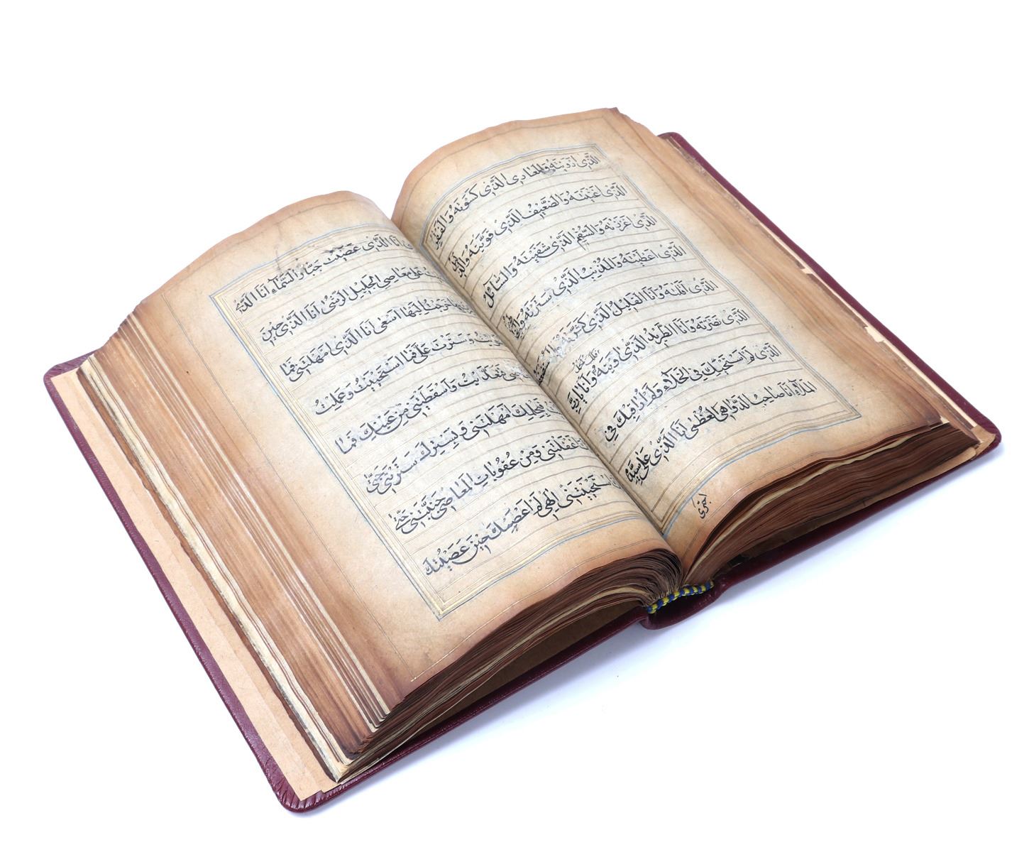 Beautifully rebound in red leather Koran written in Arabic and many pages with gold paint and some beautiful floral patterns. Probably late 18th or 19th century. Some blue panels with ornate decoration and nearly all remounted on thin paper in some area completely transparent. The first page left to right reading (O Allah, you are the one who is All-seeing, so grant me happiness and good fortune). Another page from right to left and of the most ornately decorated reading: Brother of the faith and religious spirit, he writes that as the holy Yazidi saint, the Almighty, has given his shoulder to guide the people who have died in the valley of ignorance and misguidance, through fasts, supplications, and act of worship, which are the best and the closest of knowledge to the Nile of happiness. Size 9 1/2" L x 6" W x 1" H, weight 450g. Provenance: Ex-Islamic Art Collection Pasadena