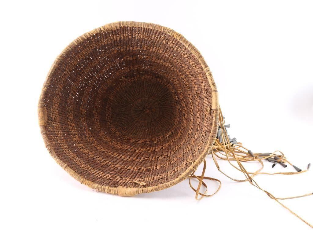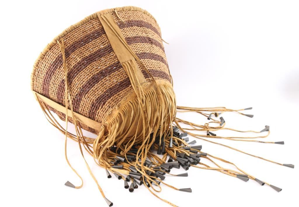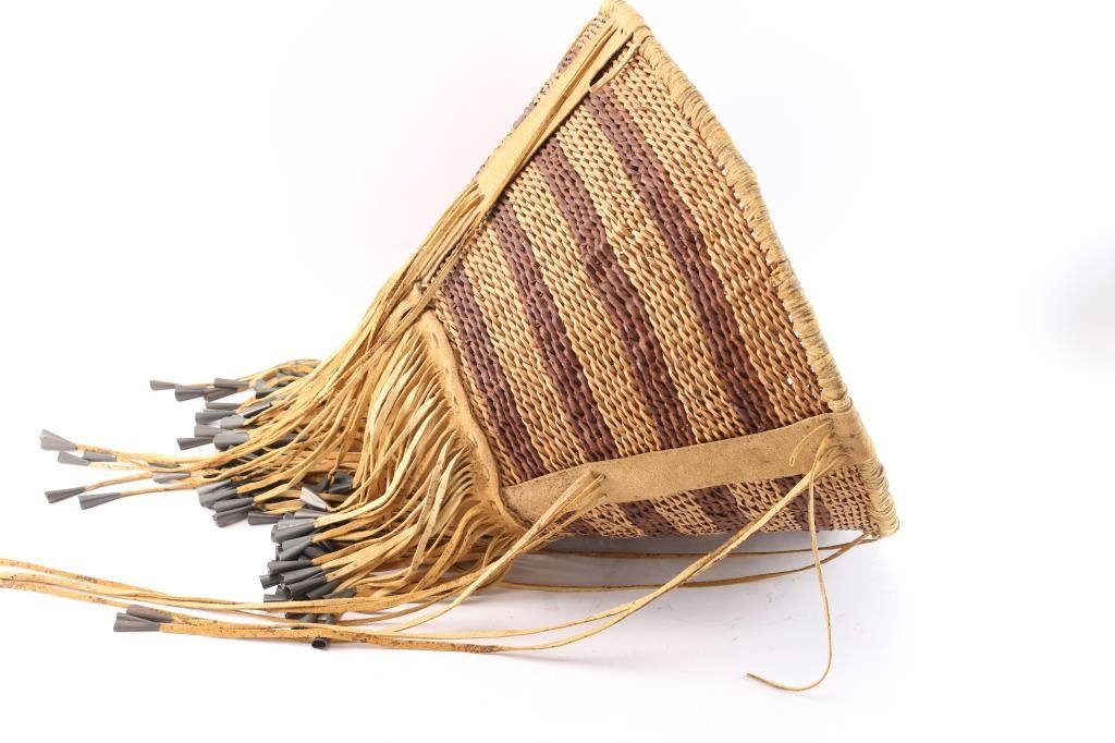 Measures 19" across opening and 14 1/2" long, with deer or cow hide tassels edged in tin cones. In excellent condition.