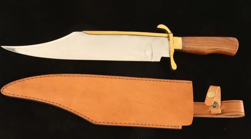 Wooden handle 191/2" overall with a 13 1/2" blade like new in box with leather sheath.