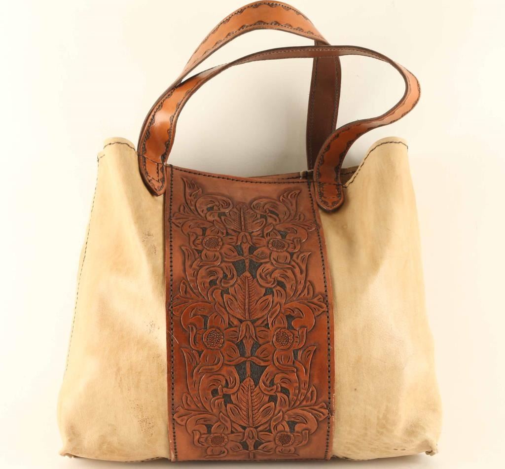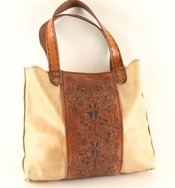 Lot includes (1) Large leather tote bag with floral design marked by Arizona Leathersmith Bill Myers.