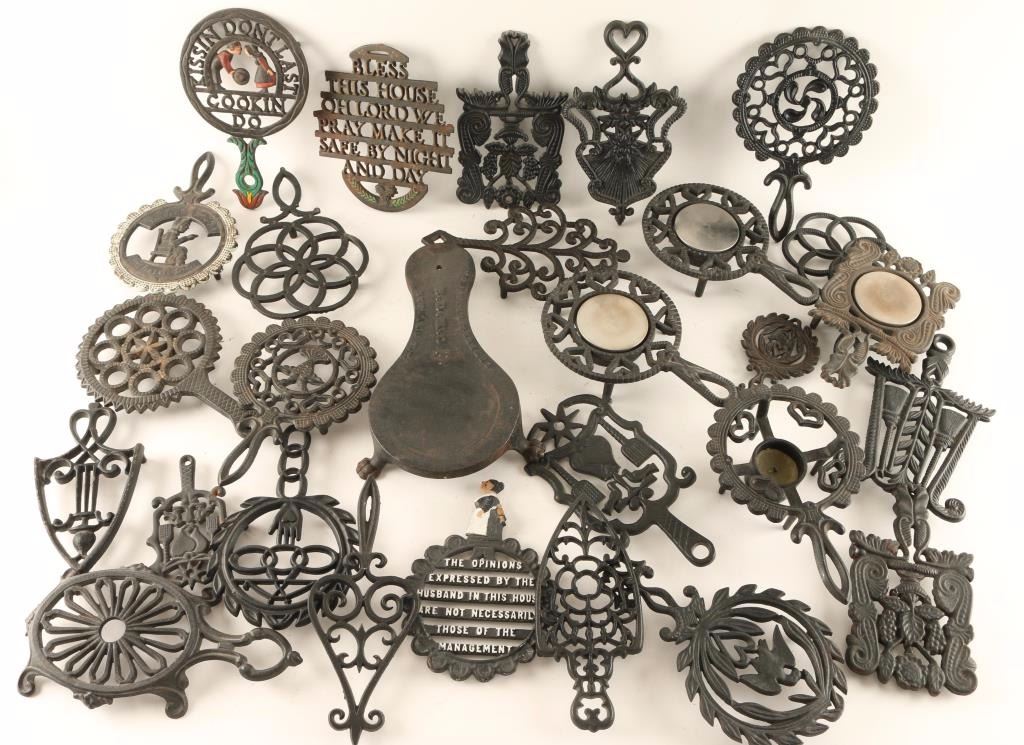 Including; several iron trivets, pot trivets, and heating trivets. Various styles and designs.