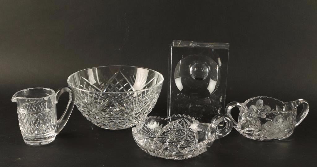 Including; a circular glass art piece, a cut glass Waterford bowl, small cut glass dish with handle, pressed glass creamer, and a pressed glass sugar.