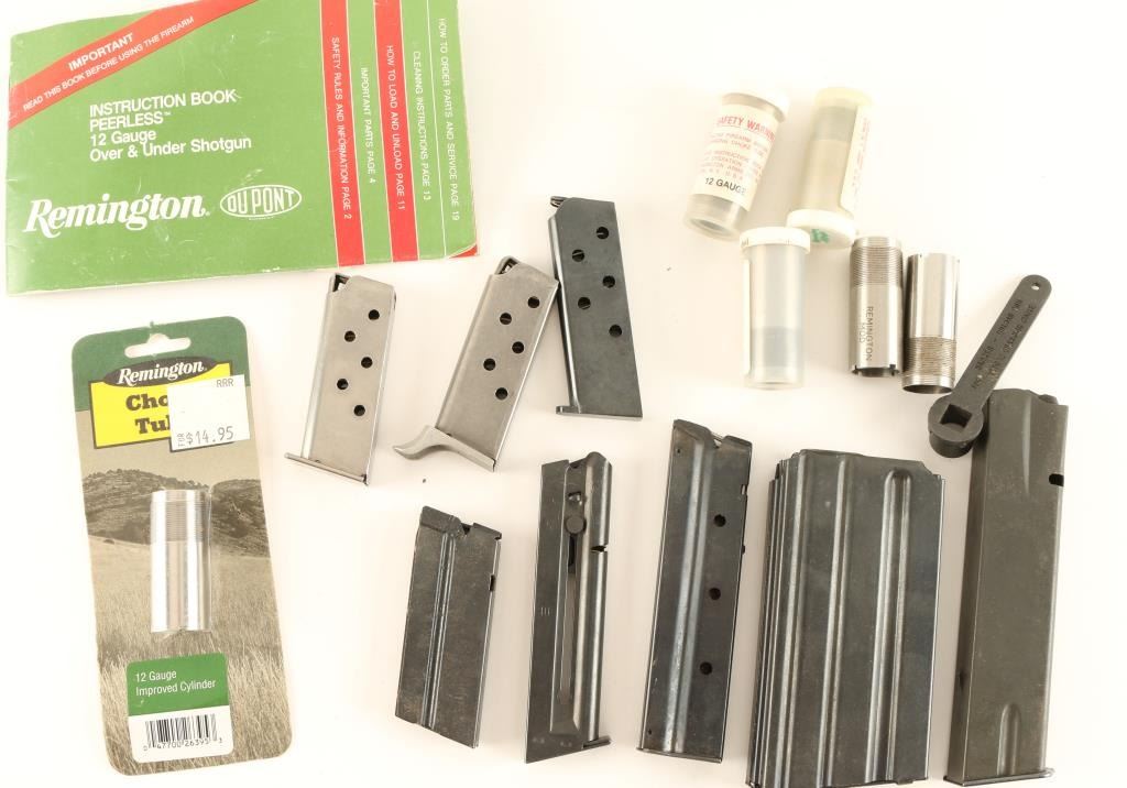Including (1) Unmarked 20 round ar-15 type (1) unmarked Hi-Power type 9mm extended magazine (1) unmarked .22 caliber pistol magazine (2) unmarked .22 caliber rifle magazines & (3) unmarked .32 or .380 magazines. Includes Remington chokes.