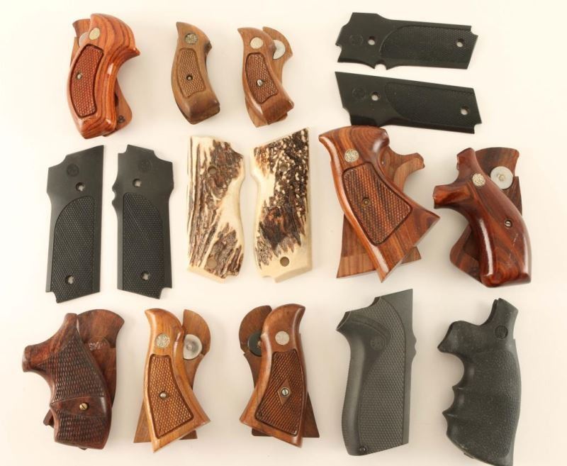 Including; 13 pairs-7 pairs of medallion grips, 1 custom stag grips for Mdl 39, and more.