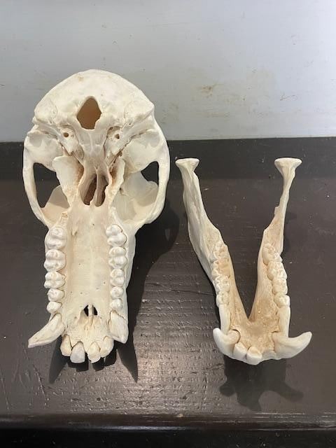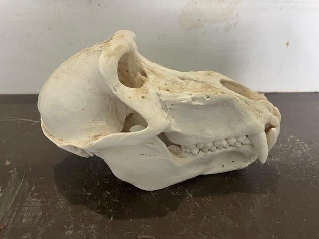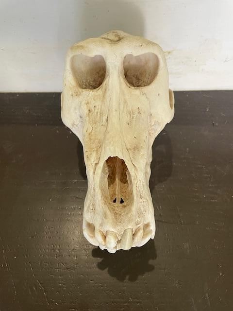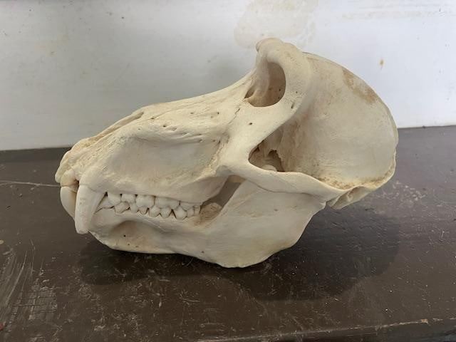 Large Male BABOON Skull. It measures 9.5" Long x 4.5" Wide. It has All the Teeth except one lower incisor (missing naturally). It has Big Fangs! SAFARI TAXIDERMY DECOR