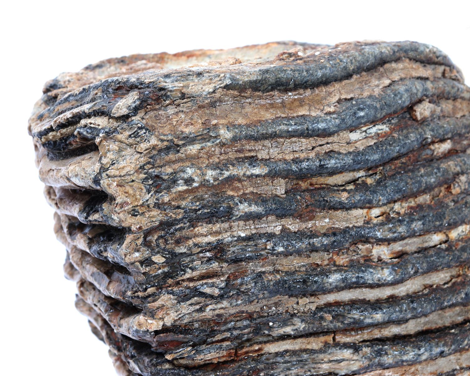 Circa 10,000–100,000 years ago. Distinguished by its substantial size and excellent structural integrity, this fossilized tooth exhibits the classic ridged grinding surfaces characteristic of mammoths, used to chew tough vegetation such as grasses and sedges. Size 6" L, Weight 4.4 lb., stand included.. Condition: Well preserved overall condition.