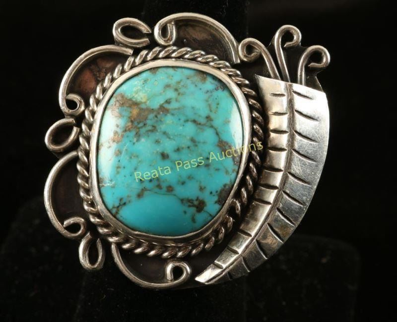 Turquoise stone with nice brown matrix surrounded by a rope design with a feather on one side and scallops on the other.