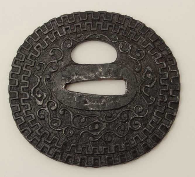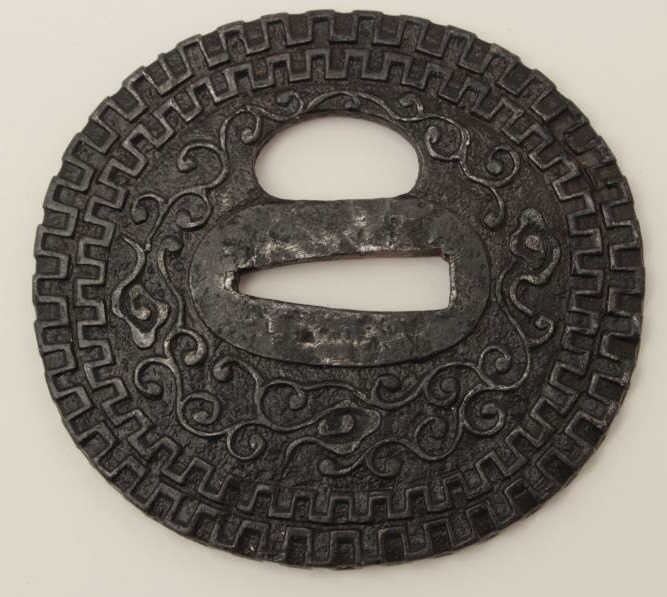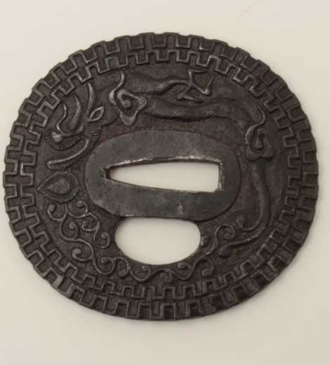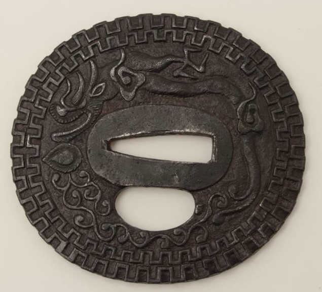 Large iron tsuba beautifully chiseled in relief with dragon and pearl. A masterpiece of the ironworker's art. 200-400 years old. EST:$400-$800
