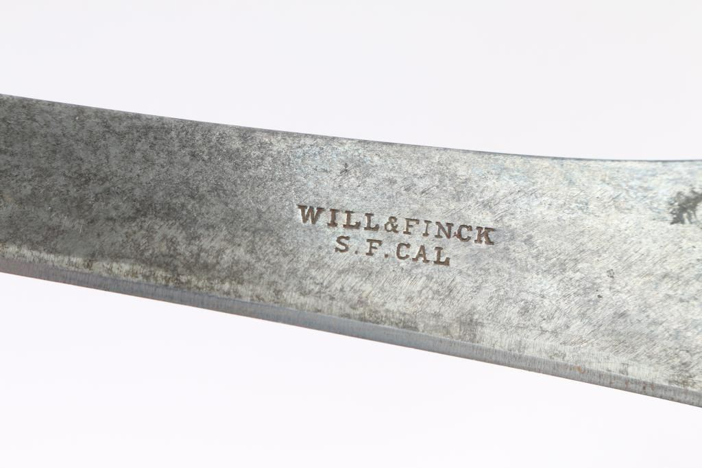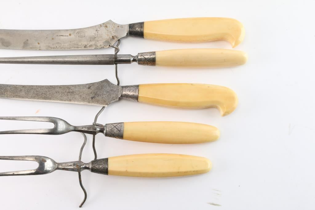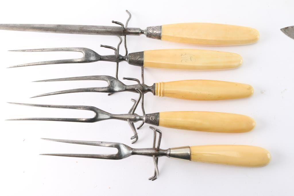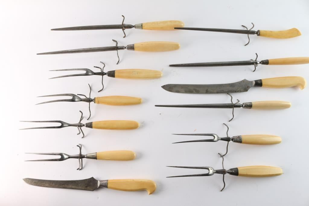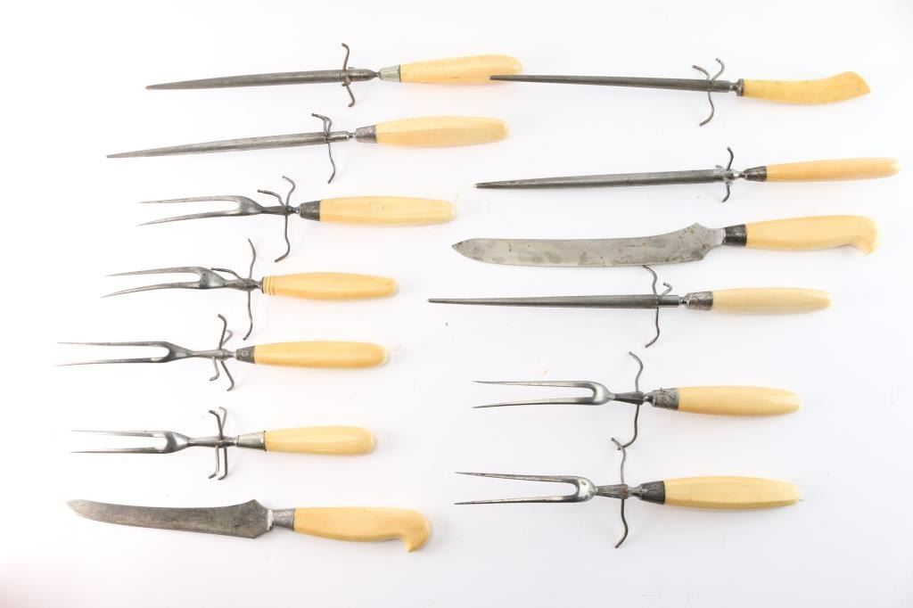 Collection of 13 pieces of carving utensils(6) Marked Will & Finck of San Francisco, CA, famous dress knife and Bowie maker of the 19th Century. (2) Marked J Lawton & Co. (5) Unmarked. Marine ivory handles with silver or German silver end caps. All good to very good condition. Compare on e-Bay at $400 plus each. From the Larry Shelton Collection.