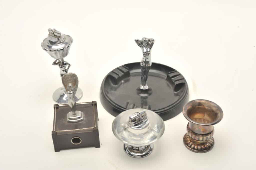Large lot of vintage and collectible “girlie” lighters, ashtrays, combination lighters/cases, etc.; some early, many later vintage; a variety of makers. (Reference: James Flanagan’s definitive work “The Big Book of Cigarette Lighters”). Est.: $450-$600.