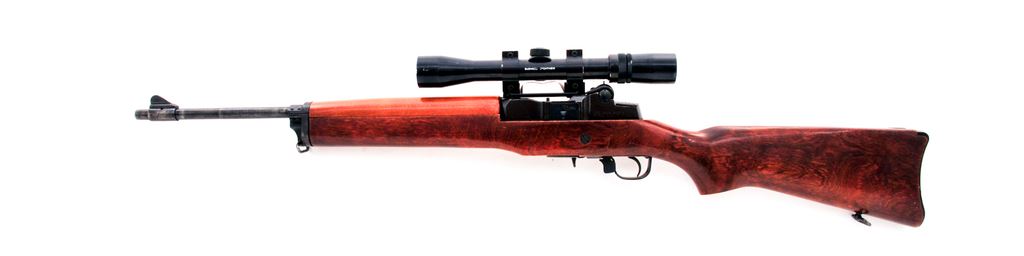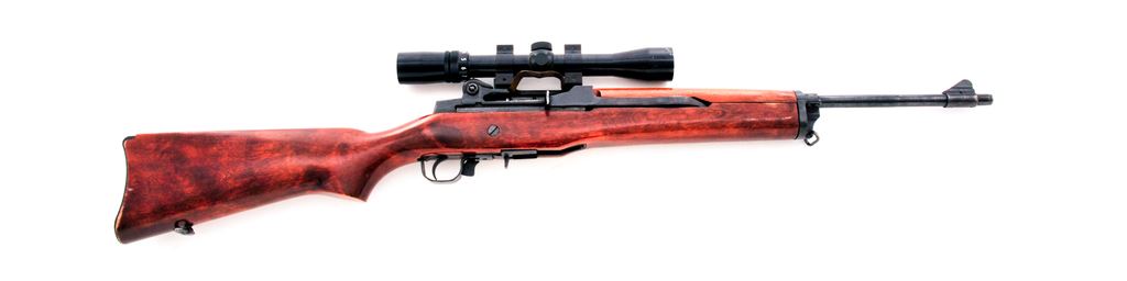 Late 70's Ruger Mini-14 Semi-Auto Project Rifle, with scope, #181-01409, .223 cal., 18.5'' barrel, blue finish, original wood stock with buttplate, sling swivels, fixed blade front sight, aperture rear sight, no magazine. Topped with a 3-9x32 scope with duplex reticle. A thin piece of brass sheet metal has been attached underneath the scope base to add as a case deflector. Mfg'd 1977. Condition is good. Metal with some specks and small patches of very light pitting and surface rust. Muzzle and highpoints with some thinning and finish loss. The walls of the magazine well with an added thin layer of a bedding type material. (Although this rifle does not come with a magazine, we did test one out. It fits tight and needed to be pushed from inside the chamber area downward in order to get it out.) Stock shows age and wear consistent with the rest of the rifle, including surface scratches and impressions. Action is good; bore with some light pitting. Scope exterior with thin scratches and scuffs; optics are clear; reticle has become detached in the center and needs repair. Est.: $200-$300. (Modern)