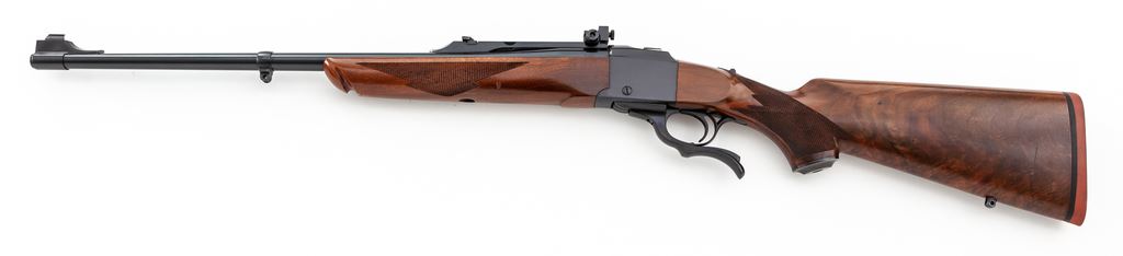 Late-70's Ruger No. 1-A Light Sporter Single Shot Rifle in 7x57mm cal., #130-42421, 22'' barrel with quarter rib, folding rear sight, fixed front sight with brass bead, and blue finish. Checkered pistol-grip walnut stock with Alexander Henry forearm, factory red rubber pad, Ruger grip cap, and sling swivel studs. Included is a NECG peep sight that is mounted to the quarter rib. Mfg'd 1977. Metal rates as excellent, with approx. 98% original blue finish showing only intermittent normal light handling marks; factory lettering is clear. Wood is very good with approx. 97% original finish and clean sharp checkering that shows no visible wear, with mostly normal small marks from field/range use. Wood with a few more noticeable marks to the left side including left side of buttstock which has a 1.5'' vertical scratch; left side and tip of forend with a total of six pressure dents with the largest being approx. 1/4'' long x 1/8'' wide. Action is crisp; bright bore is in really great condition with excellent rifling. Est.: $700-$900. (Modern)