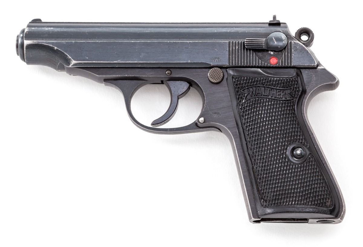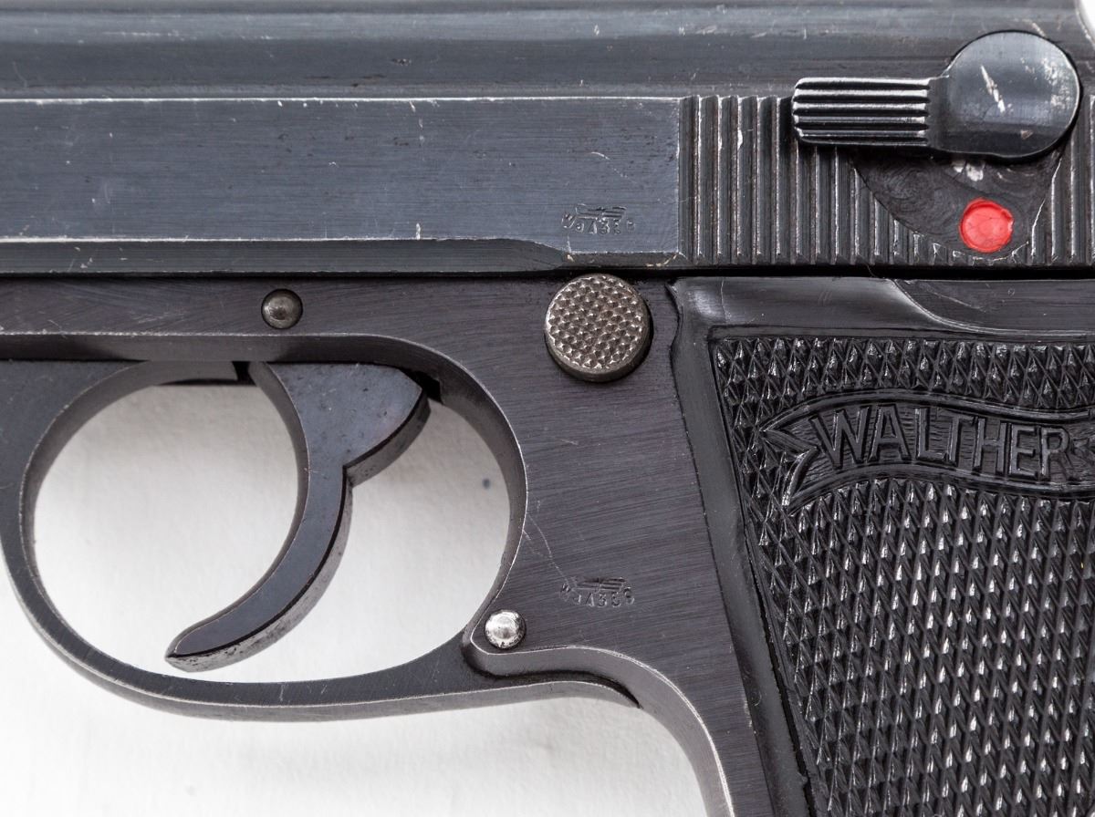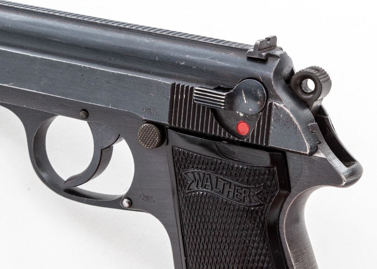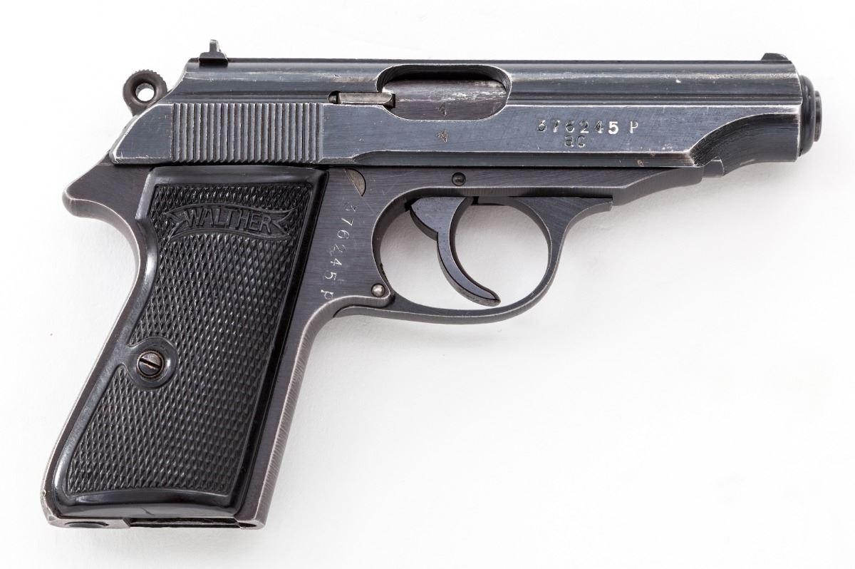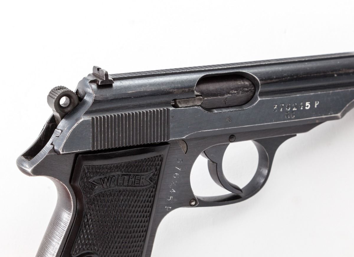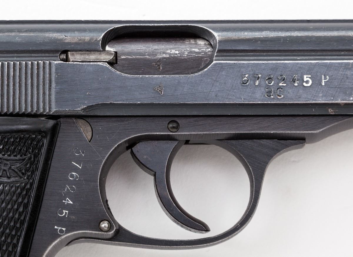 Late ''AC'' marked Wartime Walther PP Semi-Automatic Pistol, #376245p, .32 ACP cal., 3-3/4'' barrel, wartime blue finish, factory checkered black plastic grips, with ''WaA359'' proofmarks. Left side of pistol shows no nomenclature; right side with serial number ''ac'' and ''(crown)/N'' proofmarks. No mag. Condition is fine retaining approx. 90%-92% original lightly thinning blue. Front and backstrap have thinned and toned to mostly gray. Action is crisp, bore is bright. Est.: $500-$750. (C&R)