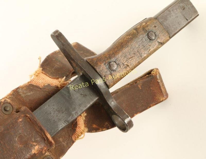 #5 serial number 70433, all metal construction 20" overall with a 15" blade. Leather sheath and hanger, which shows some damage.