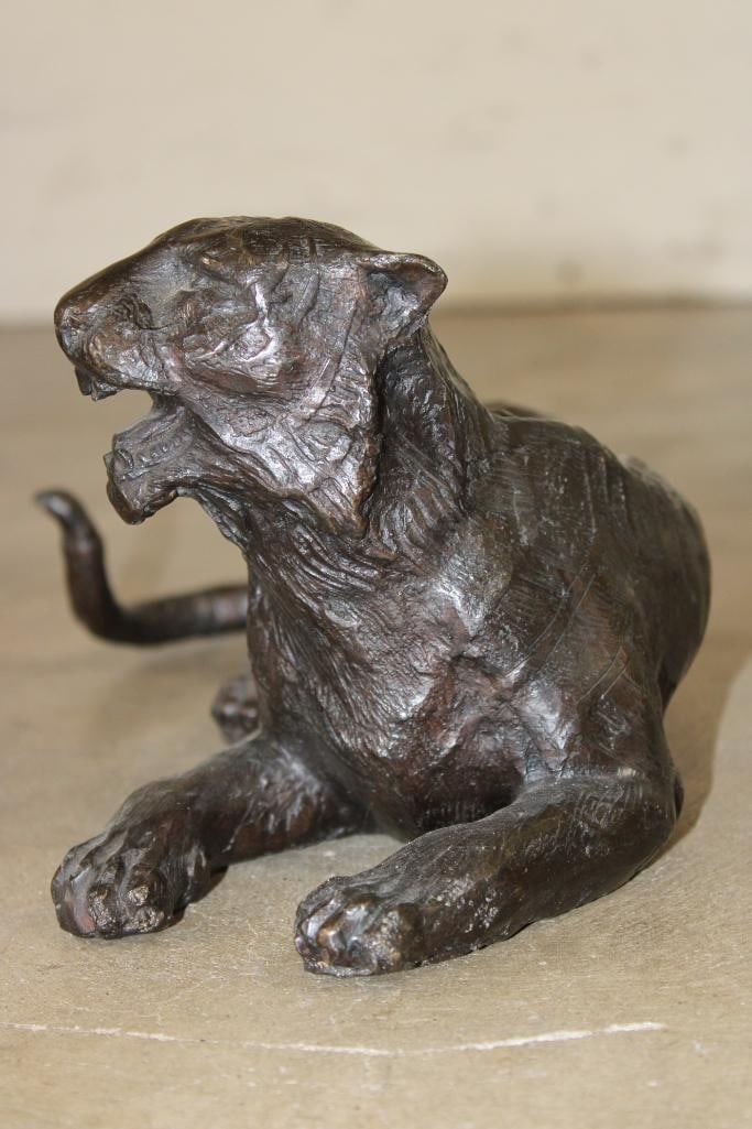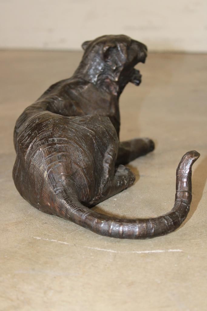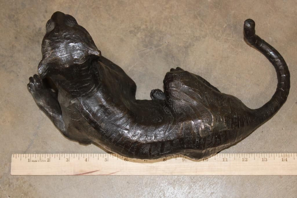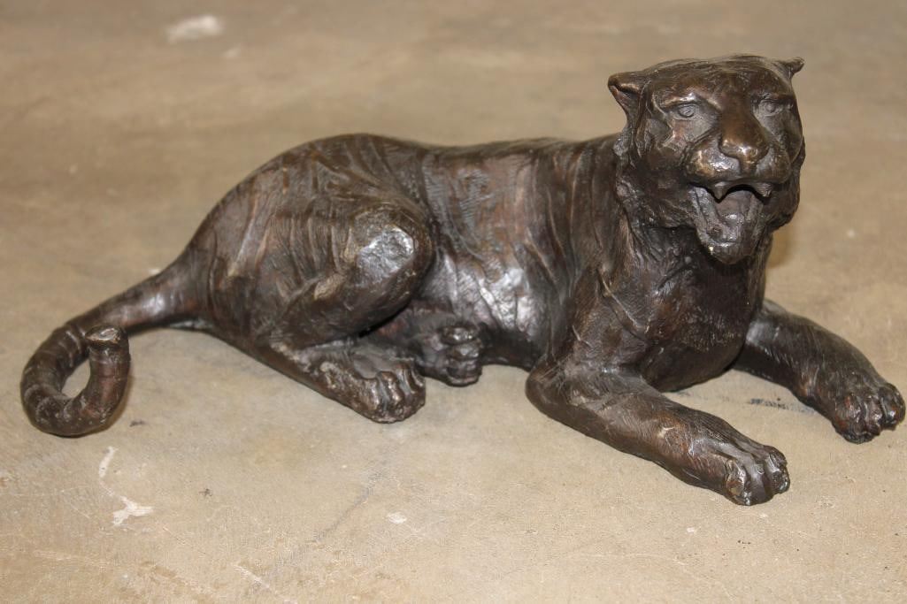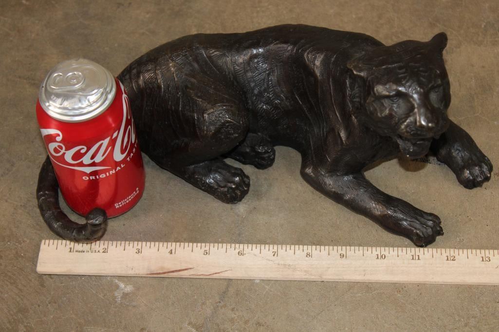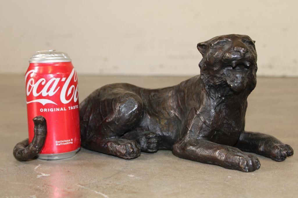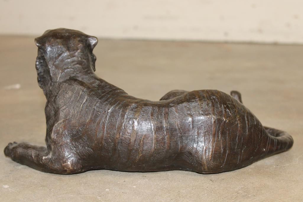 Laying TIGER Bronze Sculpture. It measures 13.75" Long x 7.5" Wide x 6.25" Tall. The Total Weight is 10 lbs. COLLECTIBLE BRONZE SCULPTURES AND STATUES