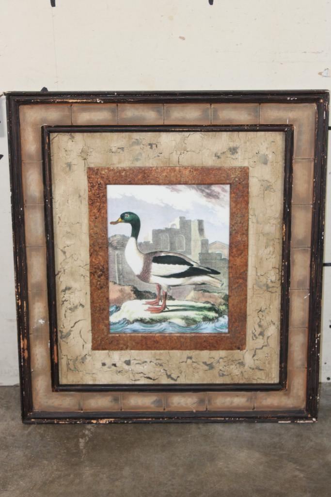 "Le Tadorne" Print after Buffon Histoire Naturell Bird Prints of 1766 by John Richard. Le Tadorne or "the shelduck" is displayed in a unique frame with a textured plaster around the image. The Wood and Glass Frame measures 28" Tall x 25" Wide. COLLECTIBLE WILDLIFE AND TAXIDERMY ART