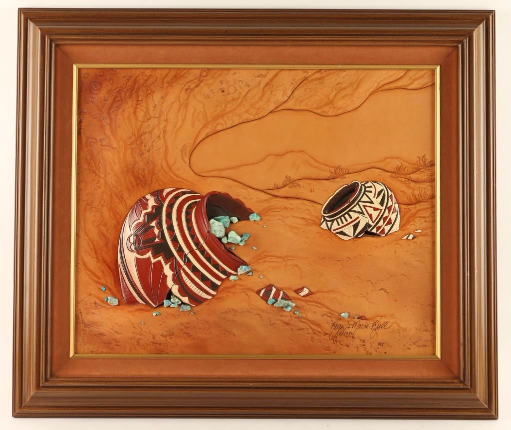 by well know leather artists Roger and Marie Krull signed lower right. Entitled "Boynton Canyon" depicting a pottery still life accented with turquoise stones. Measures 20"x16". Roger Kull's original, 3-dimensional, sculpted leather pictures are predominately of Native American pottery. People, dwellings, wildlife and the indigenous lifestyle of the Native American are reflected in his exquisite art work. Currently in Cave Creek, AZ, Roger's entire workshop consists of two tools, a swivel knife and a clay modeler's spoon. All pictures are carved completely freehand, dyed and finished with Roger Kull's special touch, the turquoise. Each unique picture is one-of-a-kind.