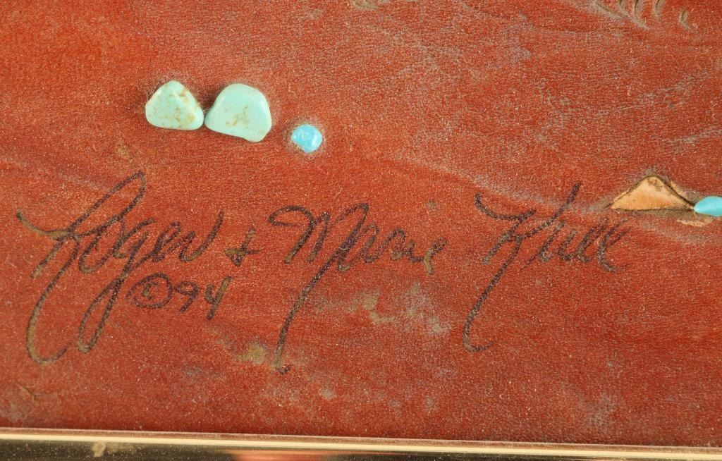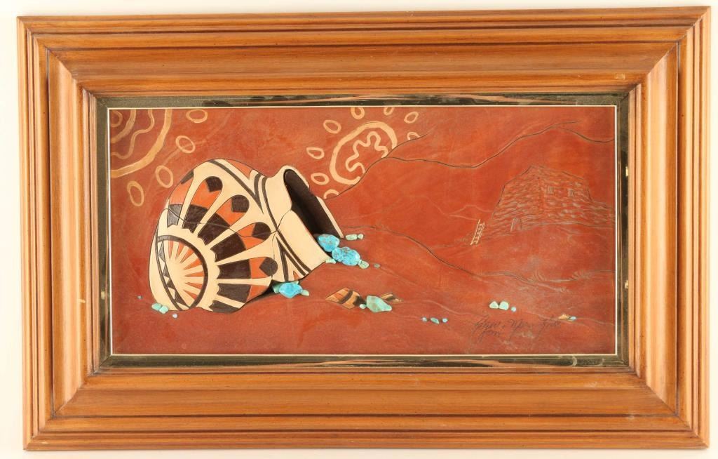By Roger & Marie Kull depicting an Indian pot in turquoise. Signed in the lower right hand corner. Measures 15 1/2" x 7".