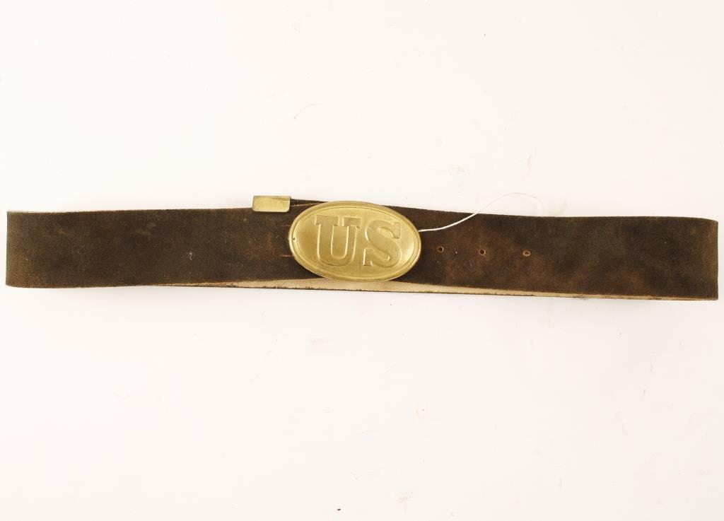 Leather Belt and Buff leather belt with oval brass "US" buckle, age unknown, possibly a Frank Burgess reproduction from the 1970s. Condition: The condition of this piece is like new. EST.: $150-$300