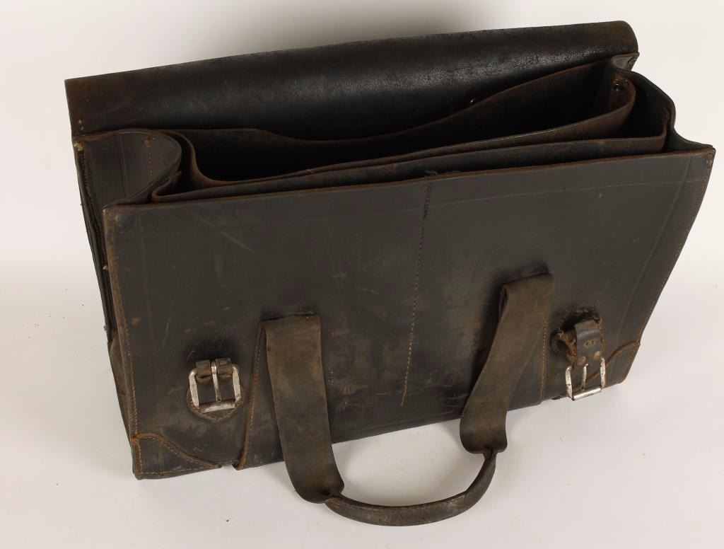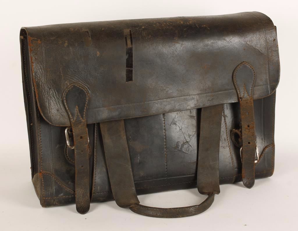 Black leather with two straps and silver metal buckles for enclosure. 2 dividers inside bag. Metal handle at top. Shows age and use.