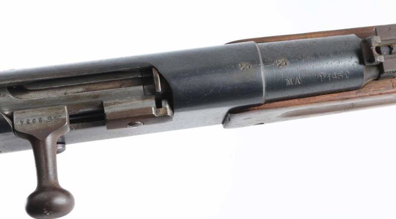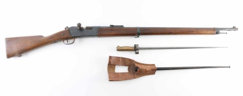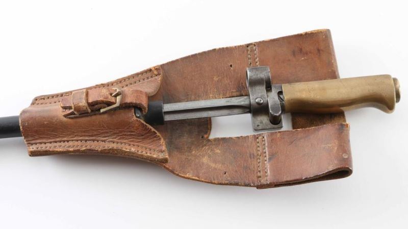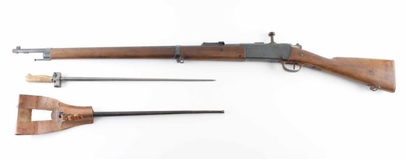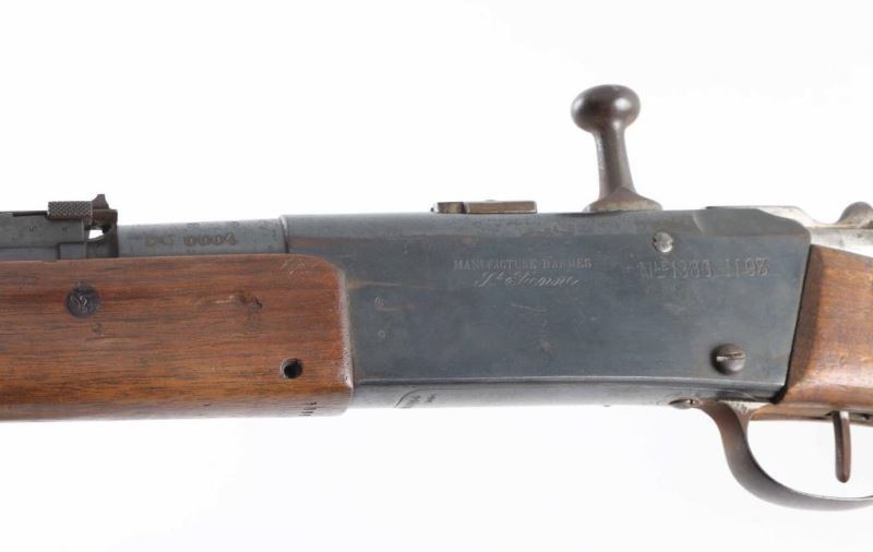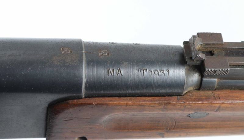 French military bolt action rifle manufactured at St Etienne, rebarreled at Tulle in 1931. Features blued finish, straight gripped wood buttstock with flat metal buttplate, wood forend with grasping grooves, 31.5" barrel, blade front sight, tangent rear sight flips forward for short range battle sight, bayonet lug, stacking hook, tubular magazine under barrel, magazine cut-off, sling swivels. Bore is good condition, bright overall with strong rifling, some darkness that appears light rust (may clean out). Metal surfaces retain 70% blued finish with scattered light patina or pits, some areas of surface rust (especially at triggerguard). Wood is good condition, with dents, some staining and finish loss. Matching numbers on bolt stem, barrel, stamped into butt. No importer marks observed. Includes very good condition needle bayonet with steel scabbard and leather frog (25" overall length, handle appears brass). Condition is NRA Good (arsenal reworked) *** C&R Firearm ***